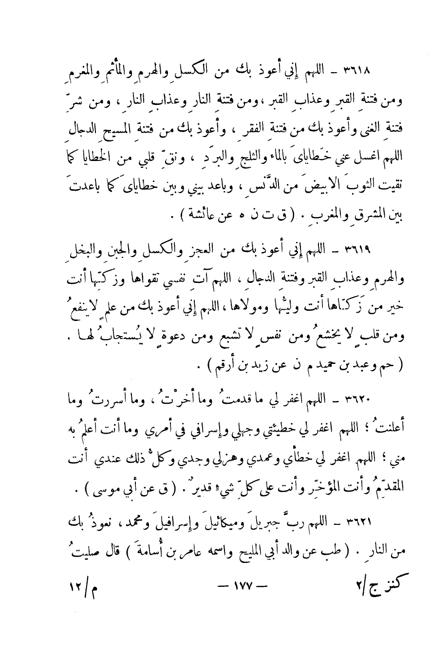 3618- "اللهم إني أعوذ بك من الكسل والهرم والمأثم والمغرم ومن فتنة القبر وعذاب القبر، ومن فتنة النار وعذاب النار، ومن شر فتنة الغنى وأعوذ بك من فتنة الفقر، وأعوذ بك من فتنة المسيح الدجال اللهم اغسل عني خطاياي بالماء والثلج والبرد، ونق قلبي من الخطايا كما نقيت الثوب الأبيض من الدنس، وباعد بيني وبين خطاياي كما باعدت بين المشرق والمغرب". "ق ت ن هـ عن عائشة".