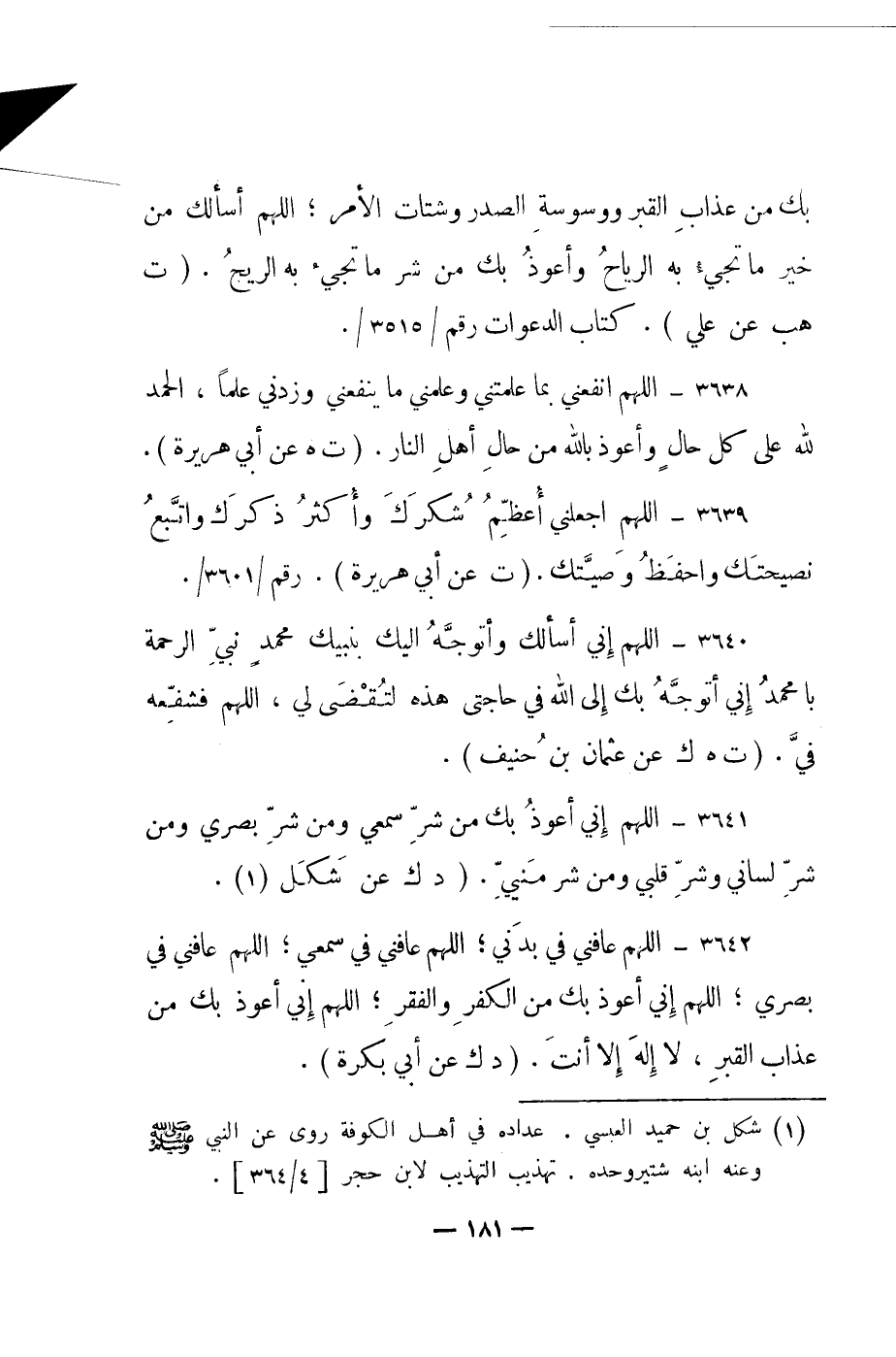 3640- "اللهم إني أسألك وأتوجه إليك بنبيك محمد نبي الرحمة يا محمد إني أتوجه بك إلى الله في حاجتي هذه لتقضى لي، اللهم فشفعه في". "ت هـ ك عن عثمان بن حنيف".