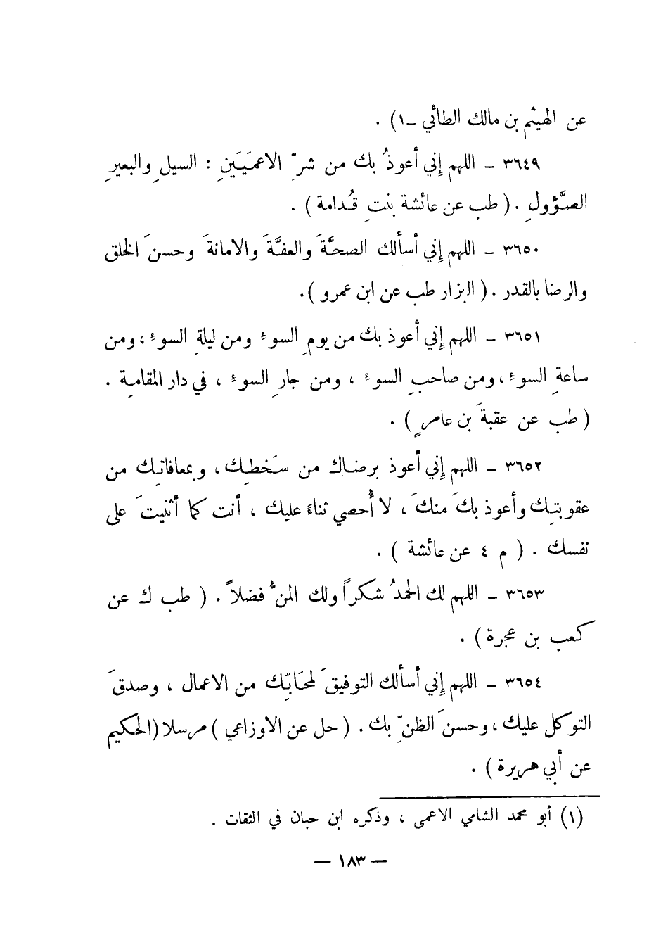3649- "اللهم إني أعوذ بك من شر الأعميين: السيل والبعير الصؤول". "طب عن عائشة بنت قدامة".