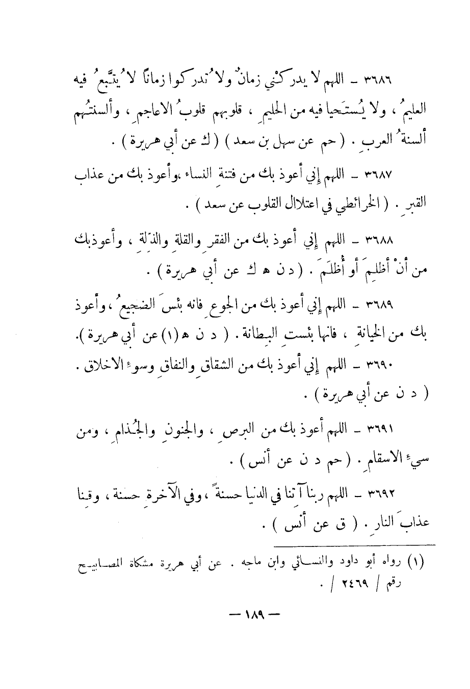 3691 – "اللهم أعوذ بك من البرص، والجنون والجذام، ومن سيء الأسقام". "حم د ن عن أنس".