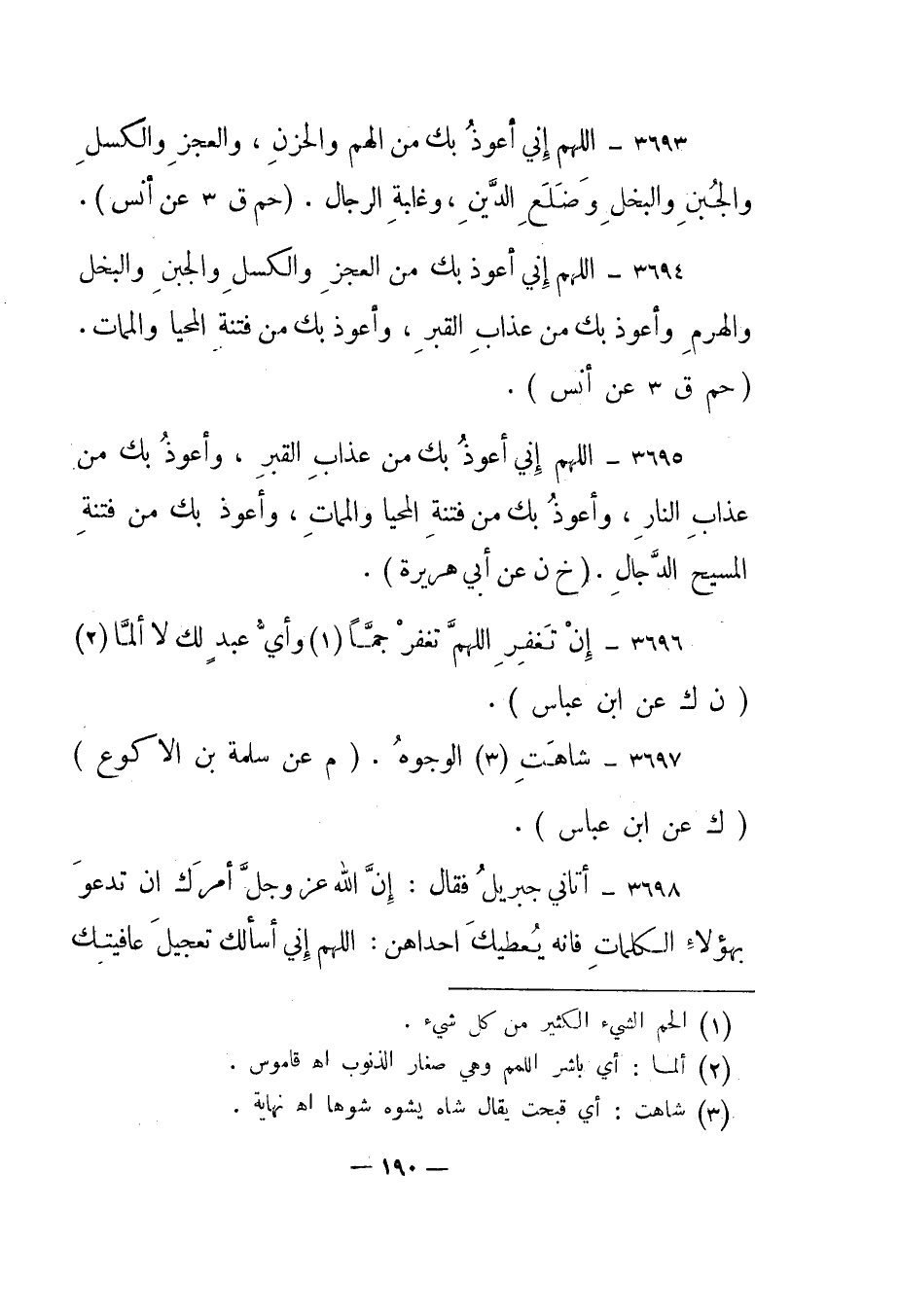 3693 – "اللهم إني أعوذ بك من الهم والحزن، والعجز والكسل والجبن والبخل وضلع الدين، وغلبة الرجال". "حم ق 3 عن أنس".