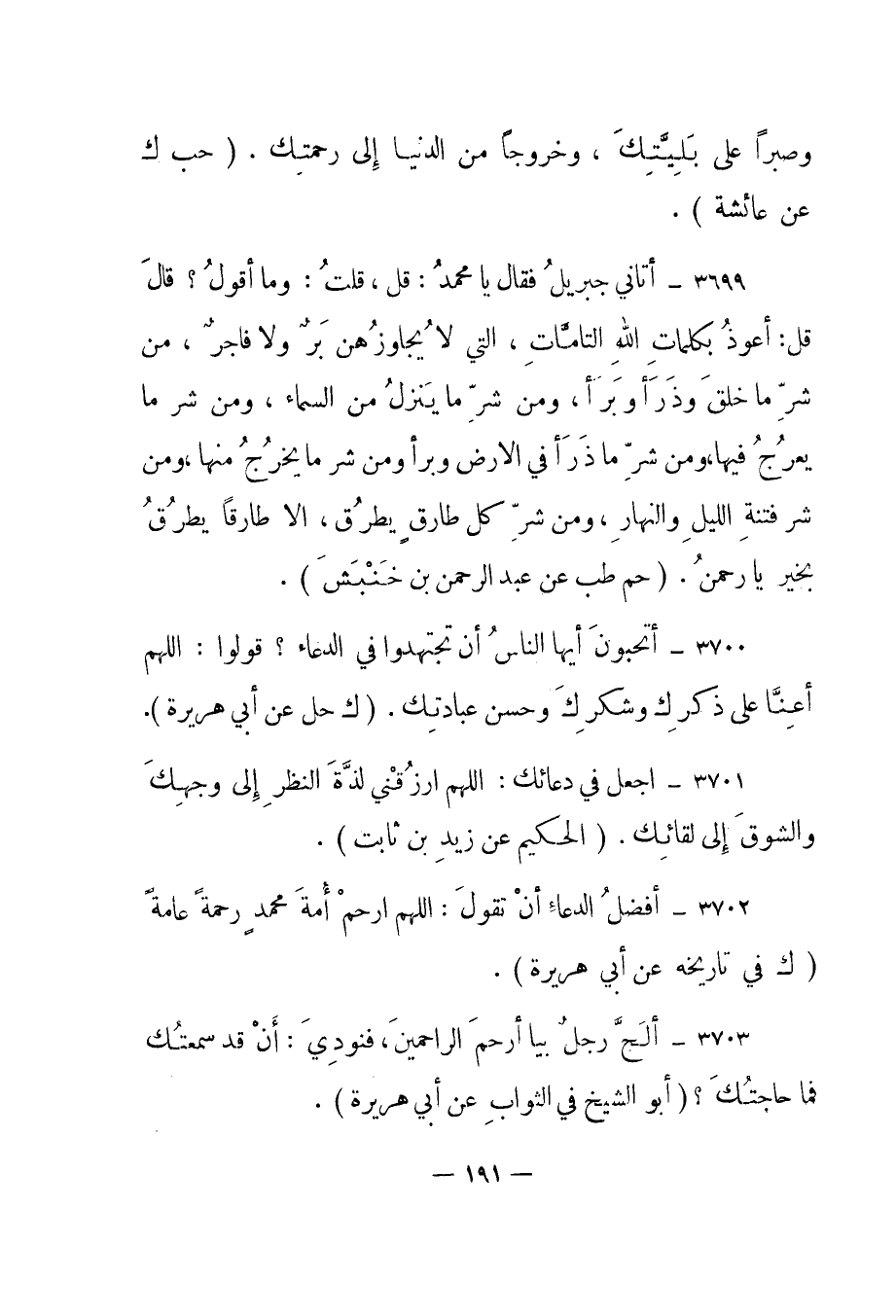 3699 – "أتاني جبريل فقال يا محمد: قل، قلت: وما أقول؟ قال قل: أعوذ بكلمات الله التامات، التي لا يجاوزهن بر ولا فاجر، من شر ما خلق وذرأ وبرأ، ومن شر ما ينزل من السماء، ومن شر ما يعرج فيها، ومن شر ما ذرأ في الأرض وبرأ ومن شر ما يخرج منها، ومن شر فتنة الليل والنهار، ومن شر كل طارق يطرق، إلا طارقا يطرق بخير يا رحمن". "حم طب عن عبد الرحمن بن خنبش".