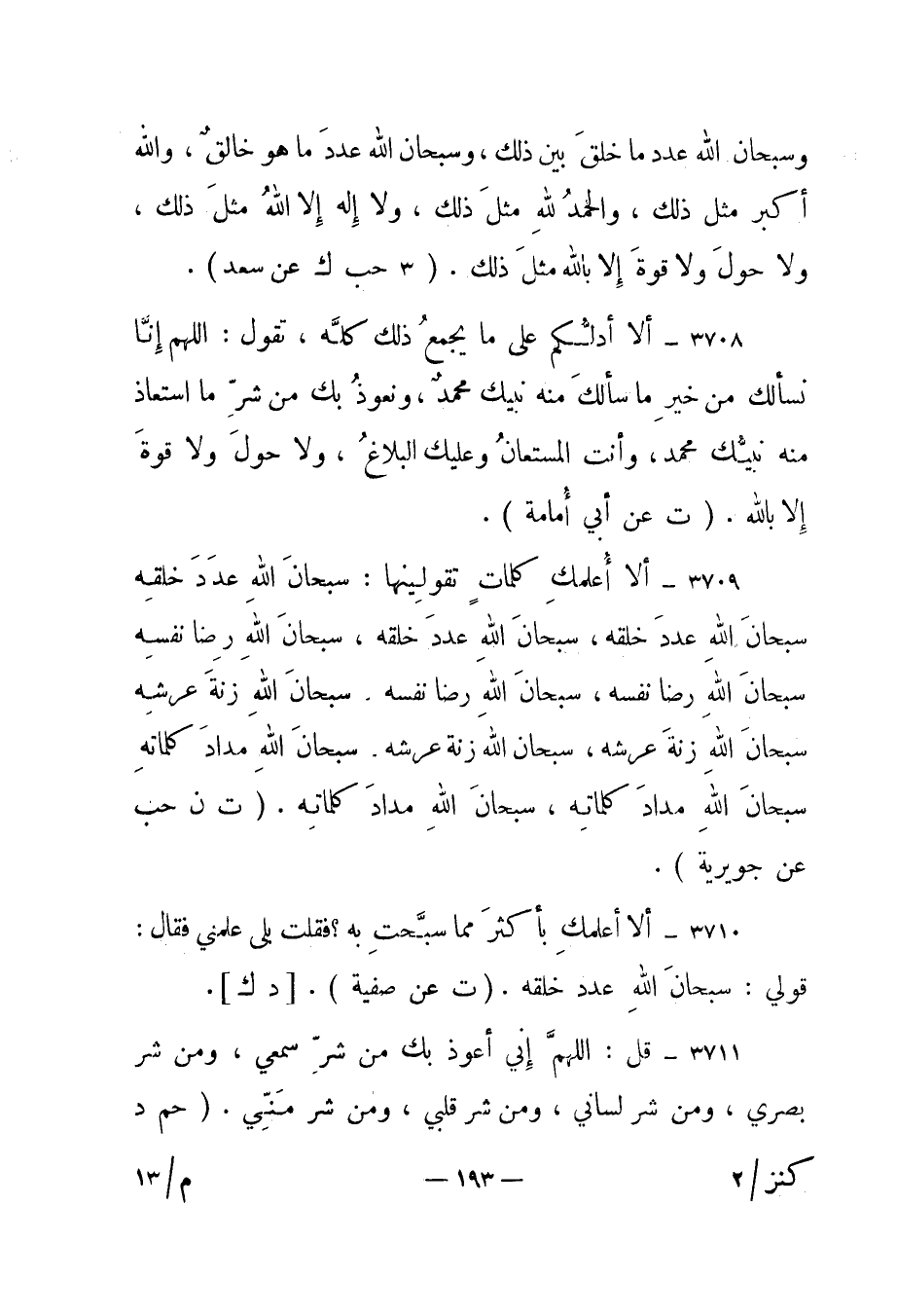 3709 – "ألا أعلمك كلمات تقولينها: سبحان الله عدد خلقه سبحان الله عدد خلقه، سبحان الله عدد خلقه، سبحان الله رضا نفسه سبحان الله رضا نفسه، سبحان الله رضا نفسه، سبحان الله زنة عرشه سبحان الله زنة عرشه، سبحان الله زنة عرشه، سبحان الله مداد كلماته سبحان الله مداد كلماته، سبحان الله مداد كلماته". "ت ن حب عن جويرية".