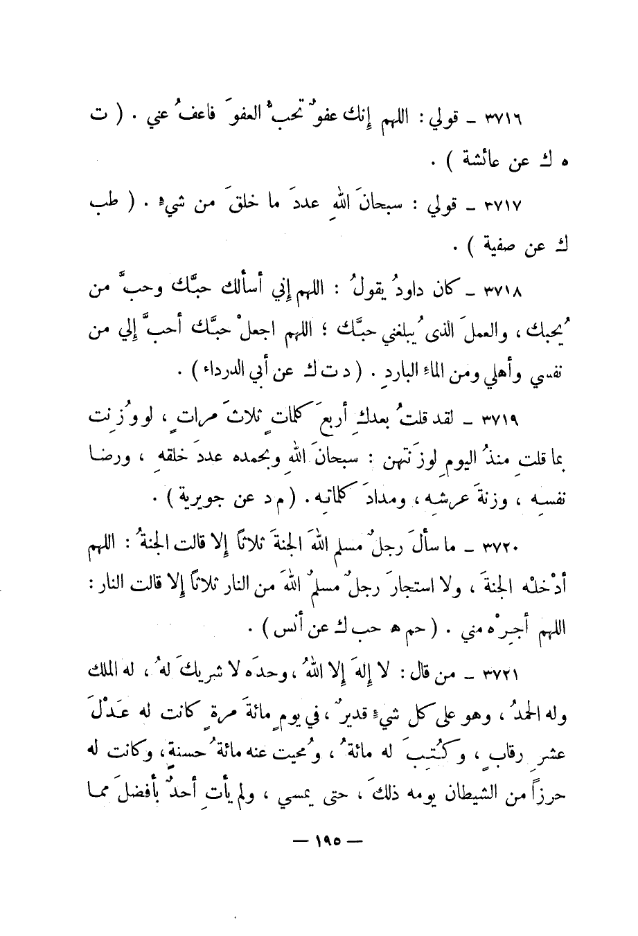 3719 – "لقد قلت بعدك أربع كلمات ثلاث مرات، لو وزنت بما قلت منذ اليوم لوزنتهن: سبحان الله وبحمده عدد خلقه، ورضا نفسه، وزنة عرشه، ومداد كلماته". "م د عن جويرية".