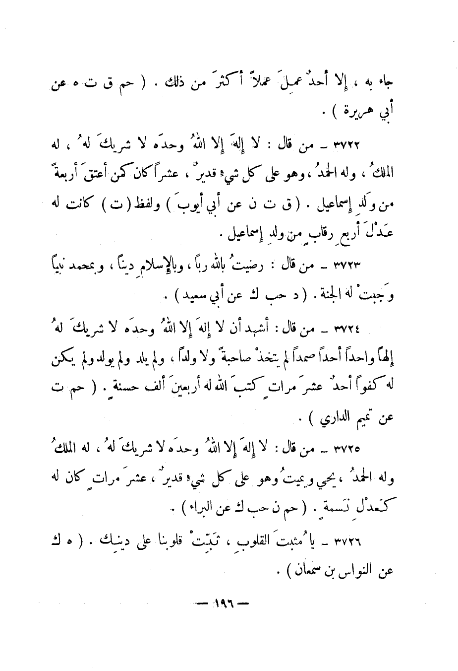 3722 – "من قال: لا إله إلا الله وحده لا شريك له، له الملك، وله الحمد، وهو على كل شيء قدير، عشرا كان كمن أعتق أربعة من ولد إسماعيل". "ق ت ن عن أيوب" ولفظ "ت" كانت له عدل أربع رقاب من ولد إسماعيل.
