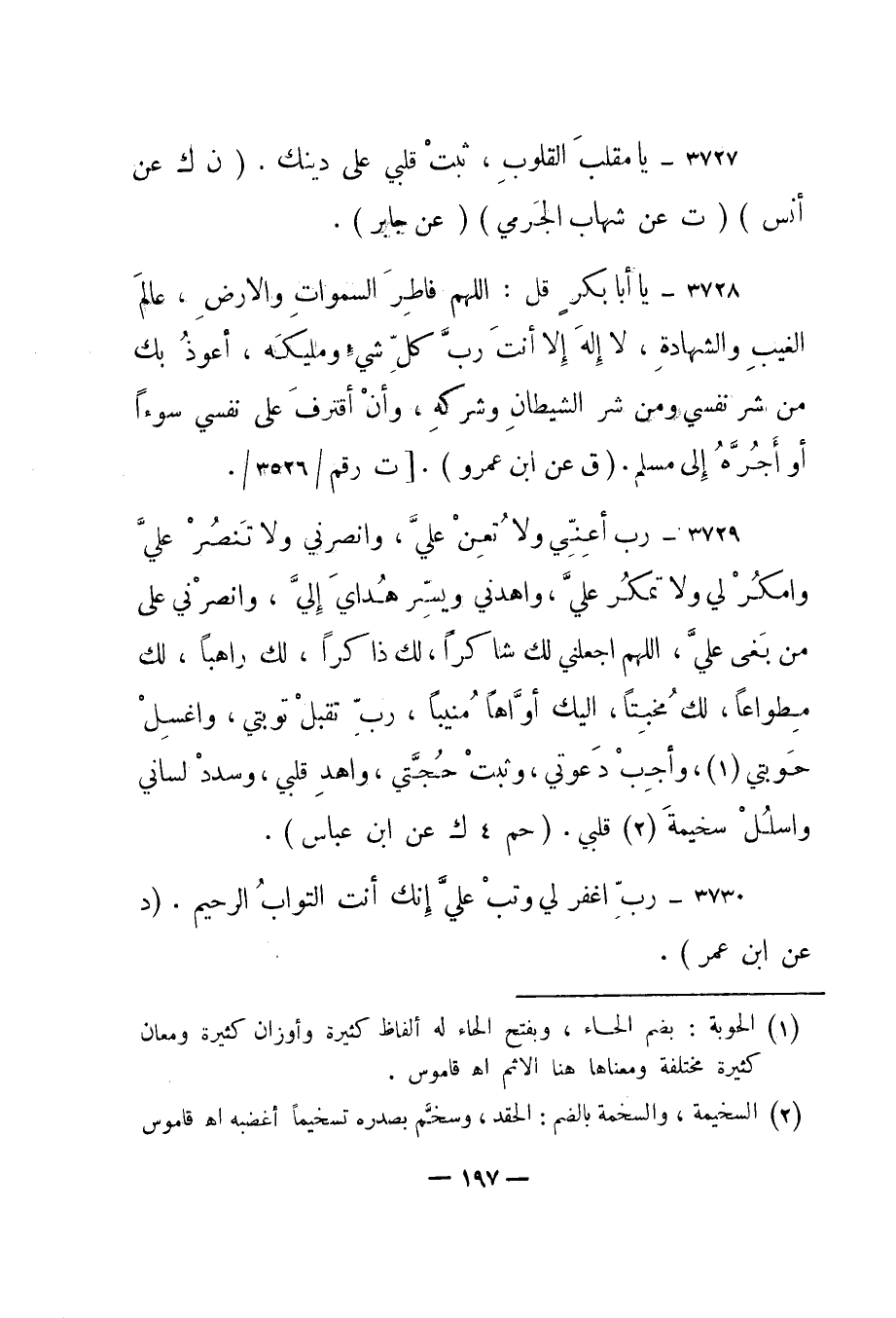 3727 – "يا مقلب القلوب، ثبت قلبي على دينك". "ن ك عن أنس" "ت عن شهاب الجرمي" "عن جابر".
