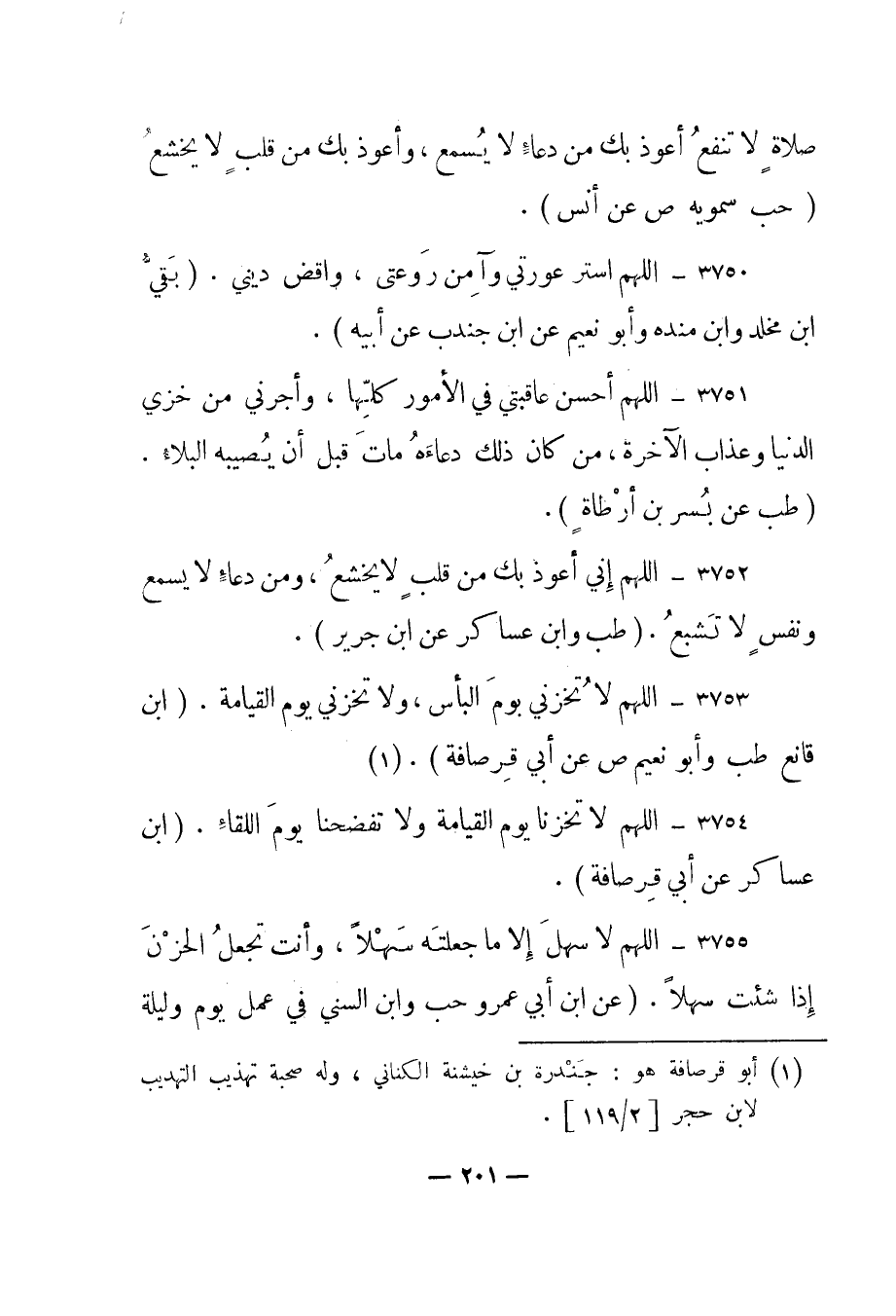 3752 – "اللهم إني أعوذ بك من قلب لا يخشع، ومن دعاء لا يسمع ونفس لا تشبع". "طب وابن عساكر عن ابن جرير".