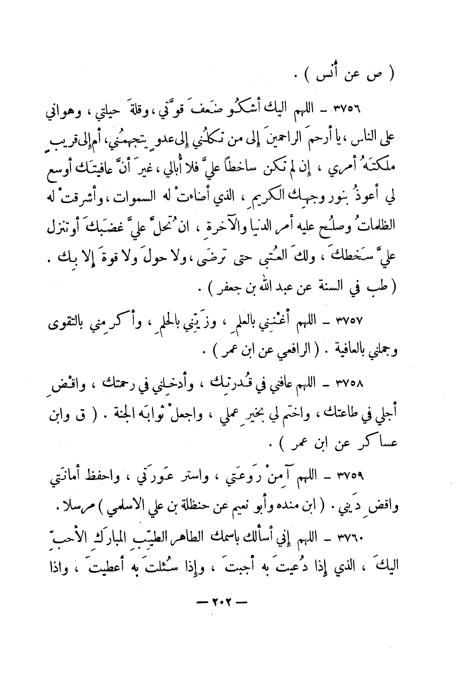 3758 – "اللهم عافني في قدرتك، وأدخلني في رحمتك، واقض أجلي في طاعتك، واختم لي بخير عملي، واجعل ثوابه الجنة". "ق وابن عساكر عن ابن عمر".