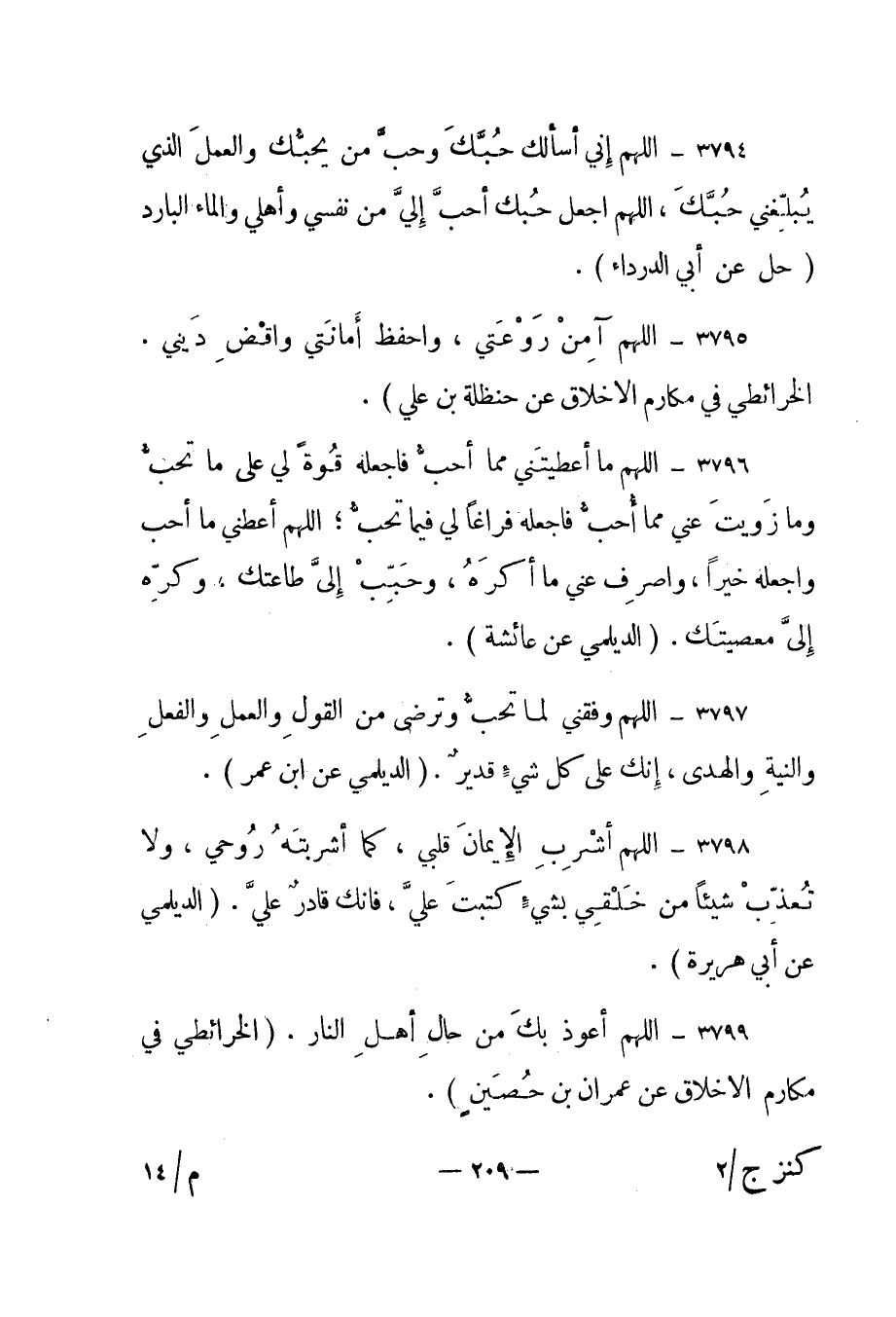 3795 – "اللهم آمن روعتي، واحفظ أمانتي واقض ديني". "الخرائطي في مكارم الاخلاق عن حنظلة بن علي".