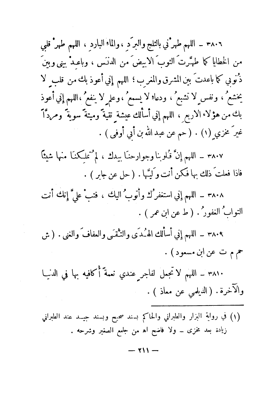 3806 – "اللهم طهرني بالثلج والبرد، والماء البارد، اللهم طهر قلبي من الخطايا كما طهرت الثوب الأبيض من الدنس، وباعد بيني وبين ذنوبي كما باعدت بين المشرق والمغرب؛ اللهم إني أعوذ بك من قلب لا يخشع، ونفس لا تشبع، ودعاء لا يسمع، وعلم لا ينفع، اللهم إني أعوذ بك من هؤلاء الأربع، اللهم إني أسألك عيشة نقية وميتة سوية ومردا غير مخزي" 1 "حم عن عبد الله بن أبي أوفى".