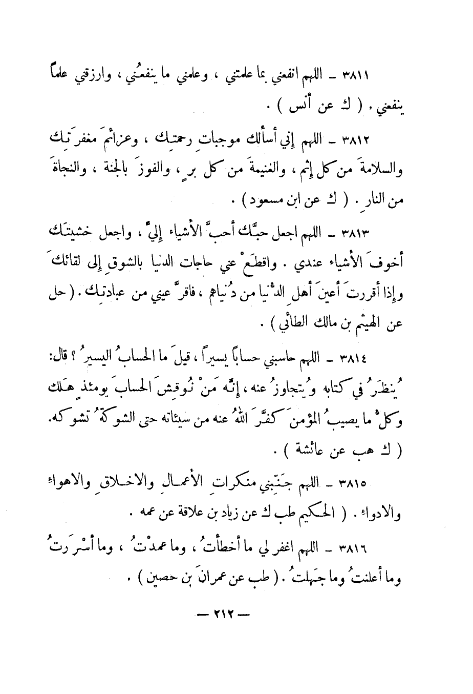 3812 – "اللهم إني أسألك موجبات رحمتك، وعزائم مغفرتك والسلامة من كل إثم، والغنيمة من كل بر، والفوز بالجنة، والنجاة من النار". "ك عن ابن مسعود".