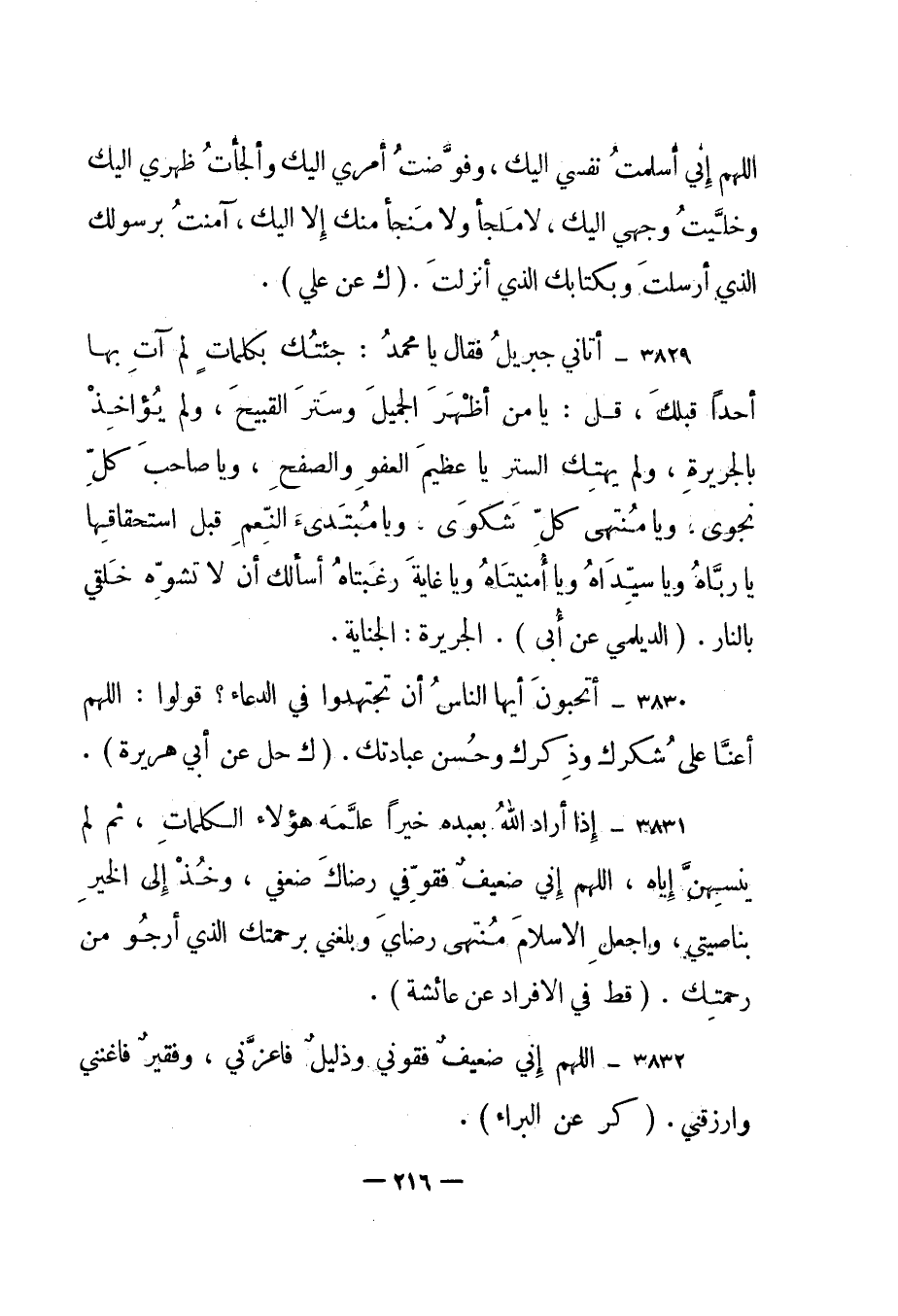 3829 – "أتاني جبريل فقال يا محمد: جئتك بكلمات لم آت بها أحدا قبلك، قل: يا من أظهر الجميل وستر القبيح، ولم يؤاخذ بالجريرة، ولم يهتك الستر يا عظيم العفو والصفح، ويا صاحب كل نجوى، ويا منتهى كل شكوى، ويا مبتدئ النعم قبل استحقاقها يا رباه ويا سيداه ويا أمنيتاه ويا غاية رغبتاه أسألك أن لا تشوه خلقي بالنار". "الديلمي عن أبي". الجريرة: الجناية.