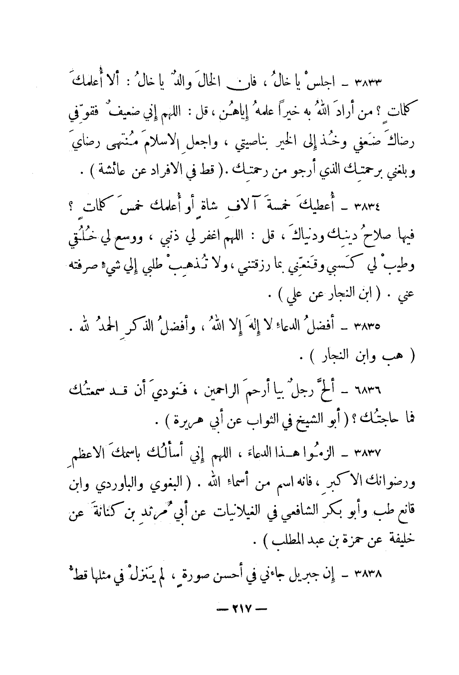 3834 – "أعطيك خمسة آلاف شاة أو أعلمك خمس كلمات؟ فيها صلاح دينك ودنياك، قل: اللهم اغفر لي ذنبي، ووسع لي خلقي وطيب لي كسبي وقنعني بما رزقتني، ولا تذهب طلبي إلى شيء صرفته عني". "ابن النجار عن علي".