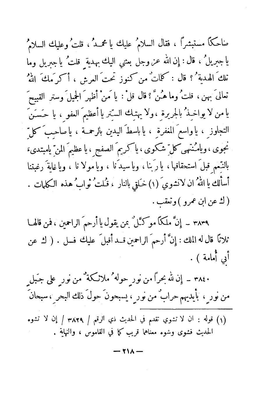3840 – "إن لله بحرا من نور حوله ملائكة من نور على جبل من نور، بأيديهم حراب من نور، يسبحون حول ذلك البحر، سبحان