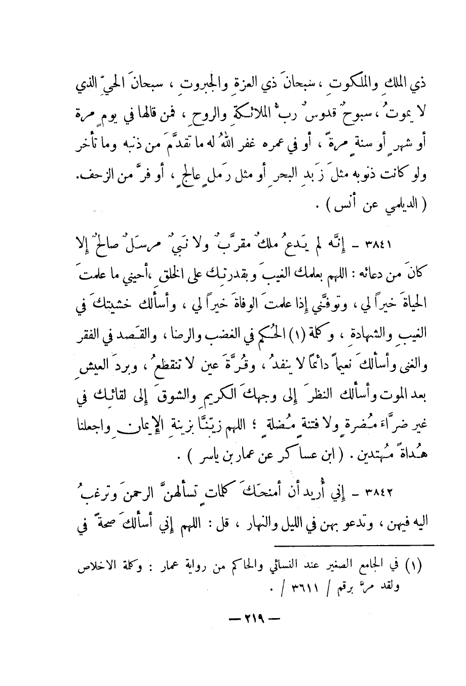3842 – "إني أريد أن أمنحك كلمات تسألهن الرحمن وترغب إليه فيهن، وتدعو بهن في الليل والنهار، قل: اللهم إني أسألك صحة في