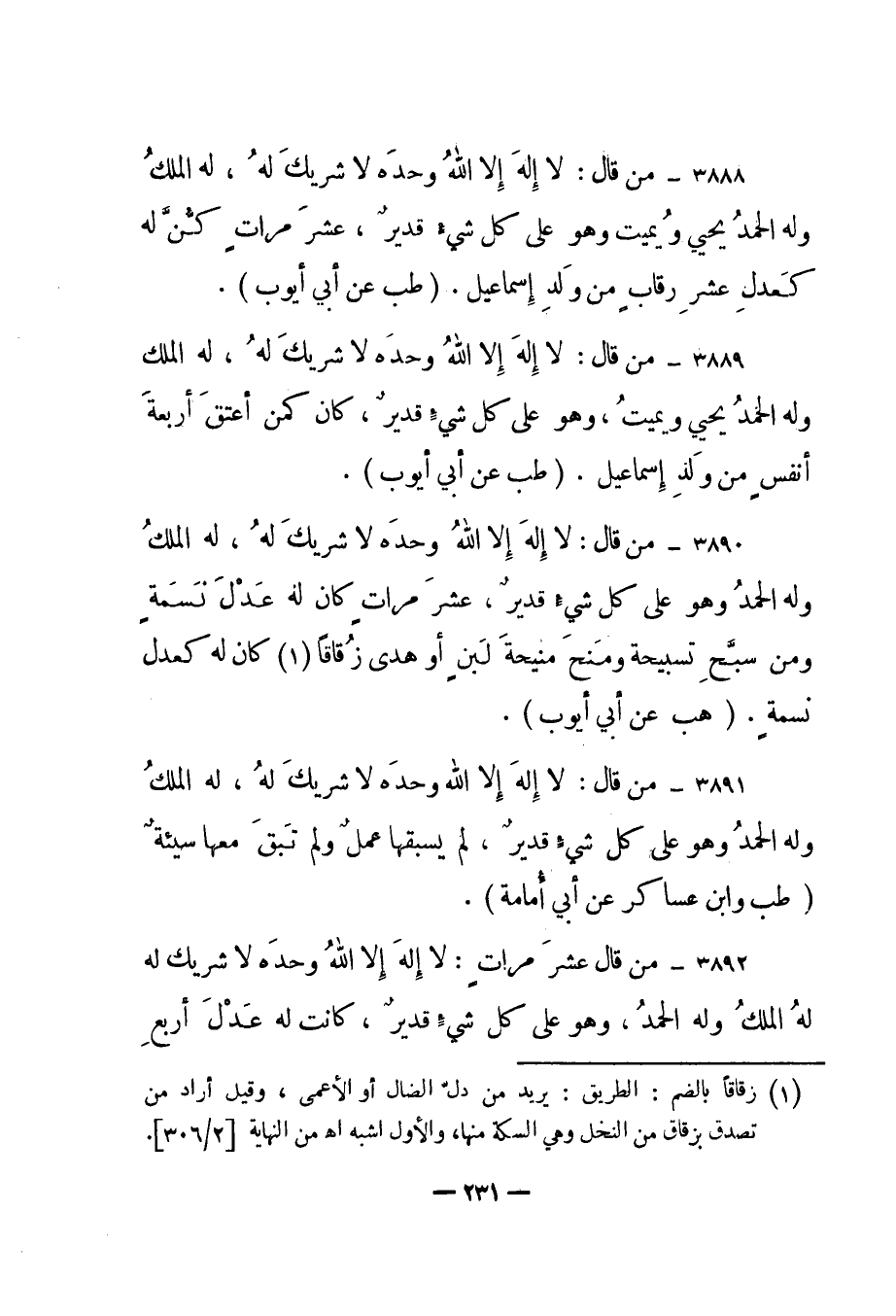 3890 – "من قال: لا إله إلا الله وحده لا شريك له، له الملك وله الحمد وهو على كل شيء قدير، عشر مرات كان له عدل نسمة ومن سبح تسبيحة ومنح منيحة لبن أو هدى زقاقا1 كان له كعدل نسمة" "هب عن أبي أيوب".