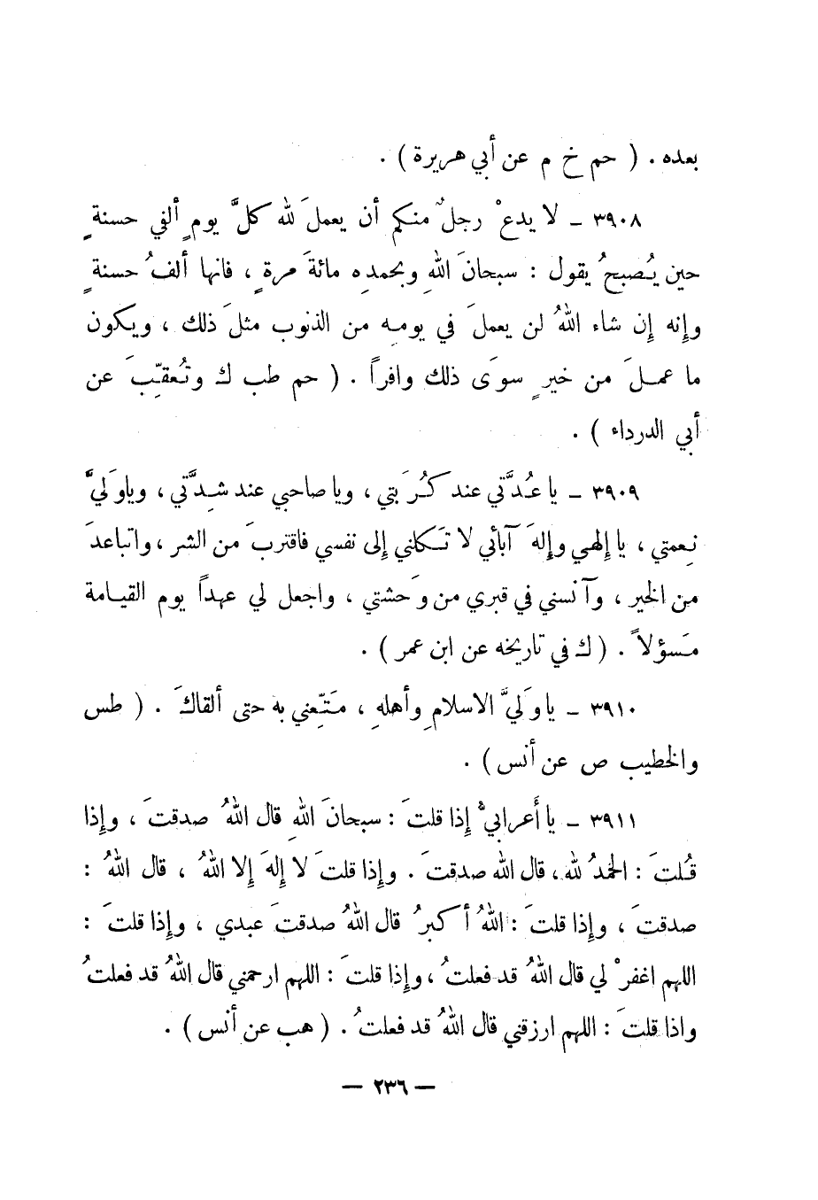 3911 – "يا أعرابي إذا قلت: سبحان الله قال الله صدقت، وإذا قلت: الحمد لله، قال الله صدقت. وإذا قلت لا إله إلا الله، قال الله: صدقت، وإذا قلت: الله أكبر قال الله صدقت عبدي، وإذا قلت: اللهم اغفر لي قال الله قد فعلت، وإذا قلت: اللهم ارحمني قال الله قد فعلت وإذا قلت: اللهم ارزقني قال الله قد فعلت". "هب عن أنس".