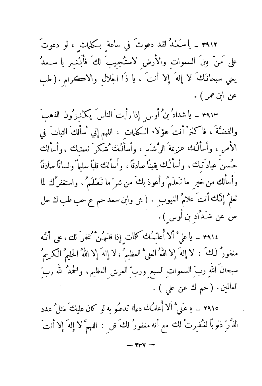3912 – "يا سعد لقد دعوت في ساعة بكلمات، لو دعوت على من بين السموات والأرض لاستجيب لك فأبشر يا سعد يعني سبحانك لا إله إلا أنت، يا ذا الجلال والإكرام" "طب عن ابن عمر".