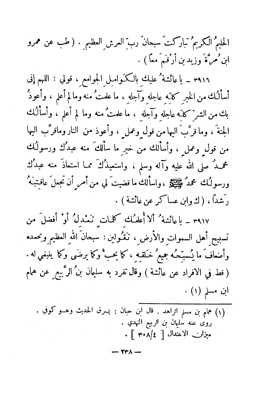 3917 – "يا عائشة ألا أعلمك كلمات تعدل أو أفضل من تسبيح أهل السموات والأرض، تقولين: سبحان الله العظيم وبحمده وأضعاف ما يسبحه جميع خلقه، كما يحب وكما يرضى وكما ينبغي له". "قط في الأفراد عن عائشة" وقال تفرد به سليمان بن الربيع عن همام بن مسلم 1