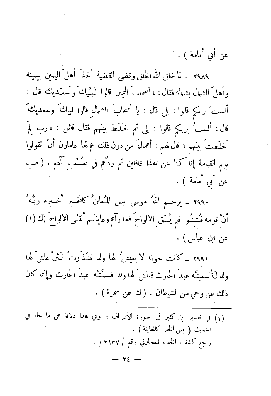 2991- "كانت حواء لا يعيش لها ولد فنذرت لئن عاش لها ولد لتسمينه عبد الحارث فعاش لها ولد فسمته عبد الحارث وإنما كان ذلك عن وحي من الشيطان". "ك عن سمرة".