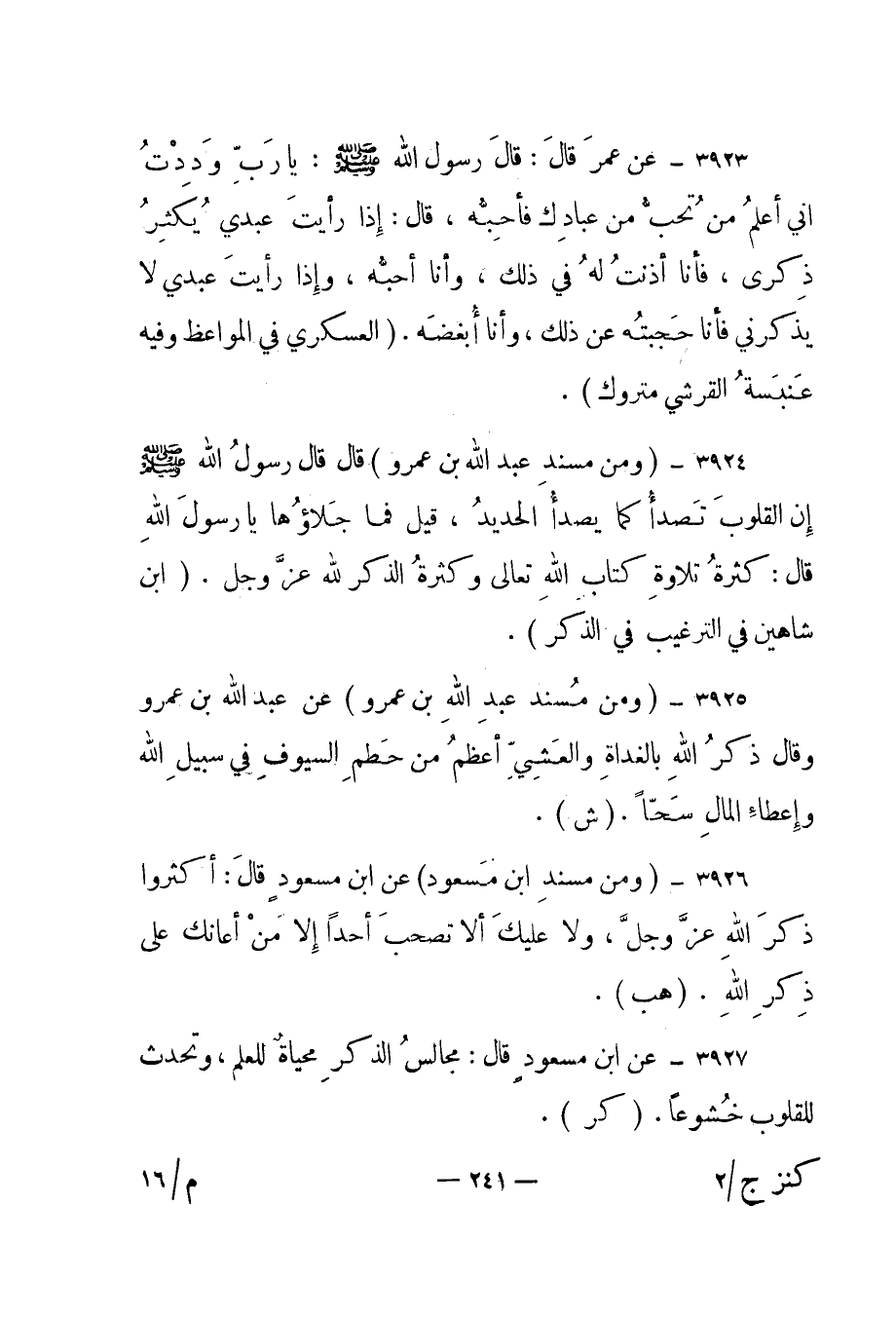 3925 - "ومن مسند عبد الله بن عمرو" عن عبد الله بن عمرو وقال "ذكر الله بالغداة والعشي أعظم من حطم السيوف في سبيل الله وإعطاء المال سحا". "ش".