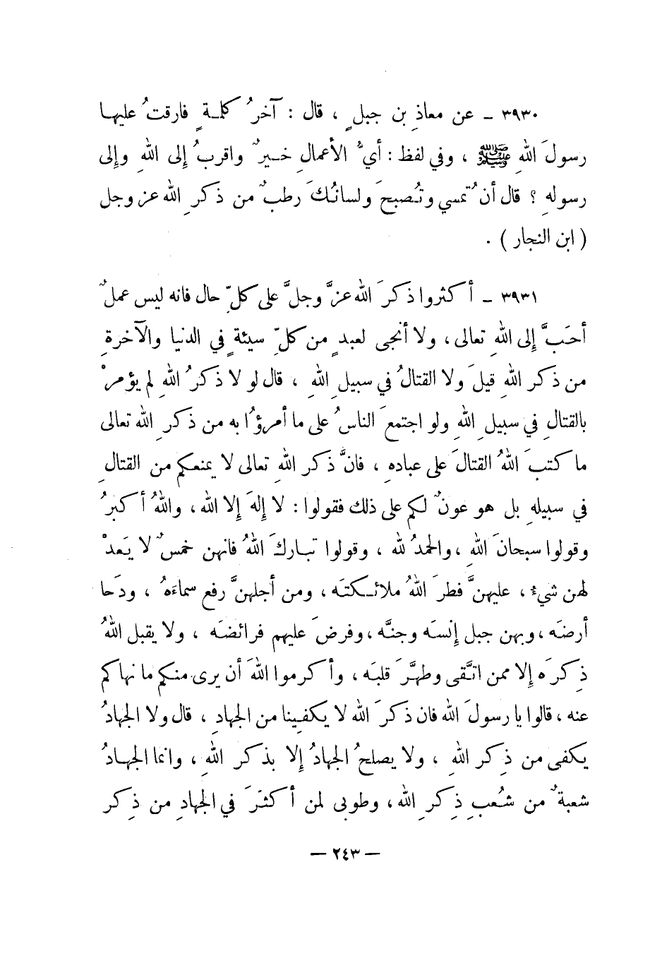 3931 – "أكثروا ذكر الله عز وجل على كل حال فإنه ليس عمل أحب إلى الله تعالى، ولا أنجى لعبد من كل سيئة في الدنيا والآخرة من ذكر الله قيل ولا القتال في سبيل الله، قال لولا ذكر الله لم يؤمر بالقتال في سبيل الله ولو اجتمع الناس على ما أمروا به من ذكر الله تعالى ما كتب الله القتال على عباده، فإن ذكر الله تعالى لا يمنعكم من القتال في سبيله بل هو عون لكم على ذلك فقولوا: لا إله إلا الله، والله أكبر وقولوا سبحان الله، والحمد لله، وقولوا تبارك الله فإنهن خمس لا يعدلهن شيء، عليهن فطر الله ملائكته، ومن أجلهن رفع سماءه، ودحا أرضه، وبهن جبل إنسه وجنه، وفرض عليهم فرائضه، ولا يقبل الله ذكره إلا ممن اتقى وطهر قلبه، وأكرموا الله أن يرى منكم ما نهاكم عنه، قالوا يا رسول الله فإن ذكر الله لا يكفينا من الجهاد، قال ولا الجهاد يكفي من ذكر الله، ولا يصلح الجهاد إلا بذكر الله، وإنما الجهاد شعبة من شعب ذكر الله، وطوبى لمن أكثر في الجهاد من ذكر