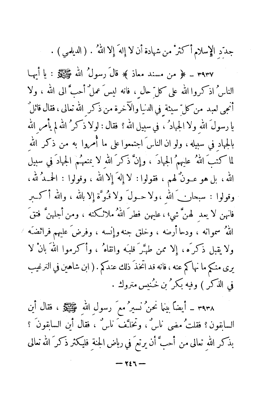 3937 – "من مسند معاذ" قال رسول الله صلى الله عليه وسلم: "يا أيها الناس اذكروا الله على كل حال، فإنه ليس عمل أحب إلى الله، ولا أنجى لعبد من كل سيئة في الدنيا والآخرة من ذكر الله تعالى، فقال قائل يا رسول الله ولا الجهاد، في سبيل الله؟ فقال: لولا ذكر الله لم يأمر الله بالجهاد في سبيله، ولو أن الناس اجتمعوا على ما أمروا به من ذكر الله لما كتب الله عليهم الجهاد، وإن ذكر الله لا يمنعهم الجهاد في سبيل الله، بل هو عون لهم، فقولوا: لا إله إلا الله، وقولوا: الحمد لله، وقولوا: سبحان الله، ولا حول ولا قوة إلا بالله، والله أكبر فإنهن لا يعدلهن شيء، عليهن فطر الله ملائكته، ومن أجلهن فتق الله سمواته، ودحا أرضه، وخلق جنه وإنسه، وفرض عليهم فرائضه ولا يقبل ذكره، إلا ممن طهر قلبه وأنقاه، وأكرموا الله بأن لا يرى منكم ما نهاكم عنه، فإنه قد اتخذ ذلك عندكم". "ابن شاهين في الترغيب في الذكر" وفيه بكر بن خنيس متروك.