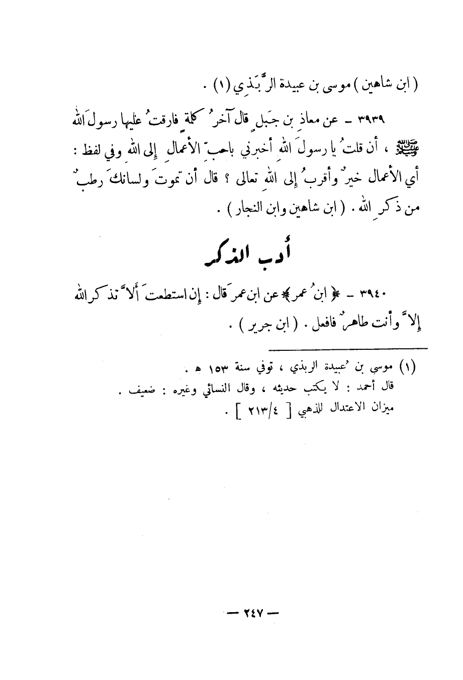 3939 - عن معاذ بن جبل قال آخر كلمة فارقت عليها رسول الله صلى الله عليه وسلم، أن قلت يا رسول الله أخبرني بأحب الأعمال إلى الله وفي لفظ: أي الأعمال خير وأقرب إلى الله تعالى؟ قال "أن تموت ولسانك رطب من ذكر الله". "ابن شاهين وابن النجار".