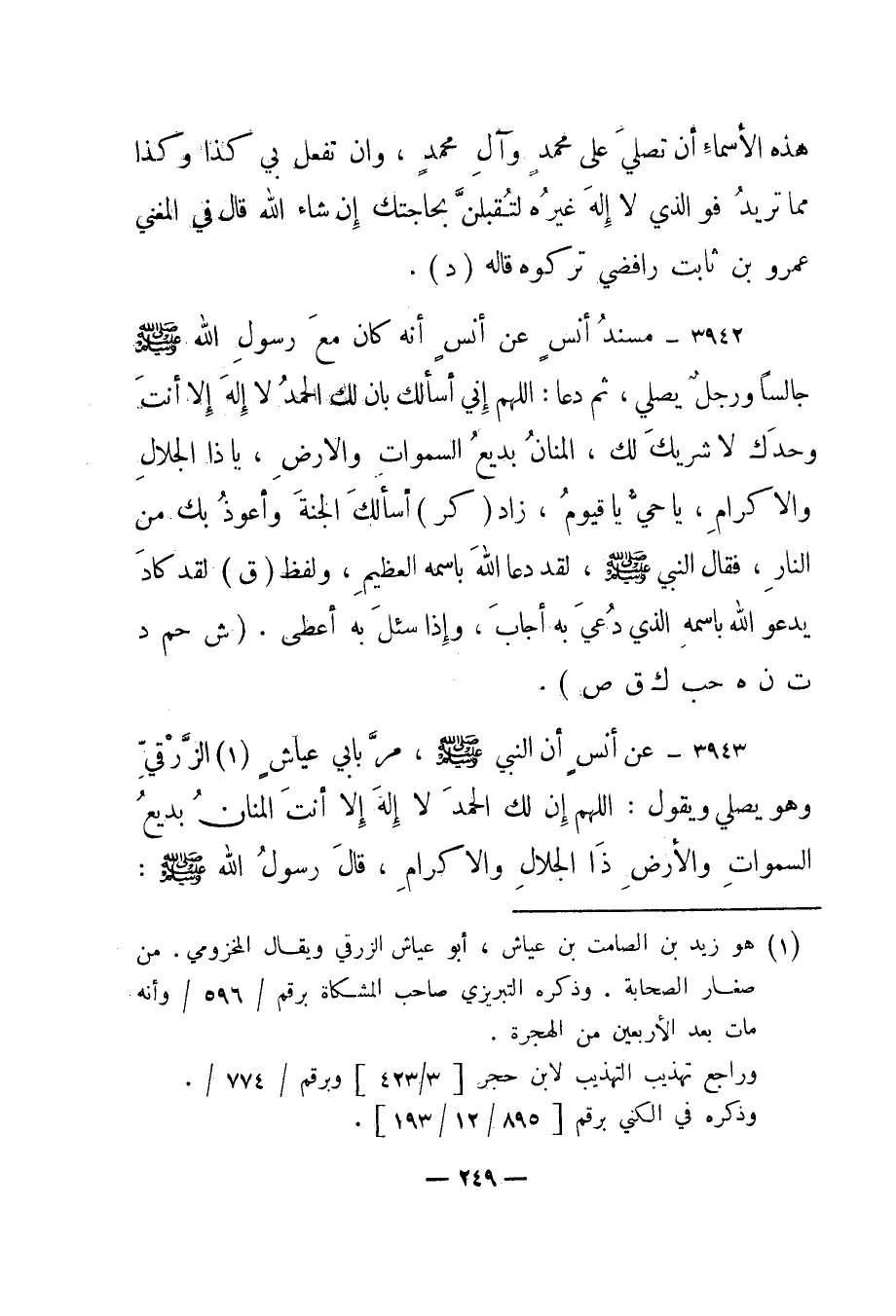 3943 - عن أنس أن النبي صلى الله عليه وسلم، مر بأبي عياش1 الزرقي وهو يصلي ويقول: "اللهم إن لك الحمد لا إله إلا أنت المنان بديع السموات والأرض ذا الجلال والإكرام، قال رسول الله صلى الله عليه وسلم: