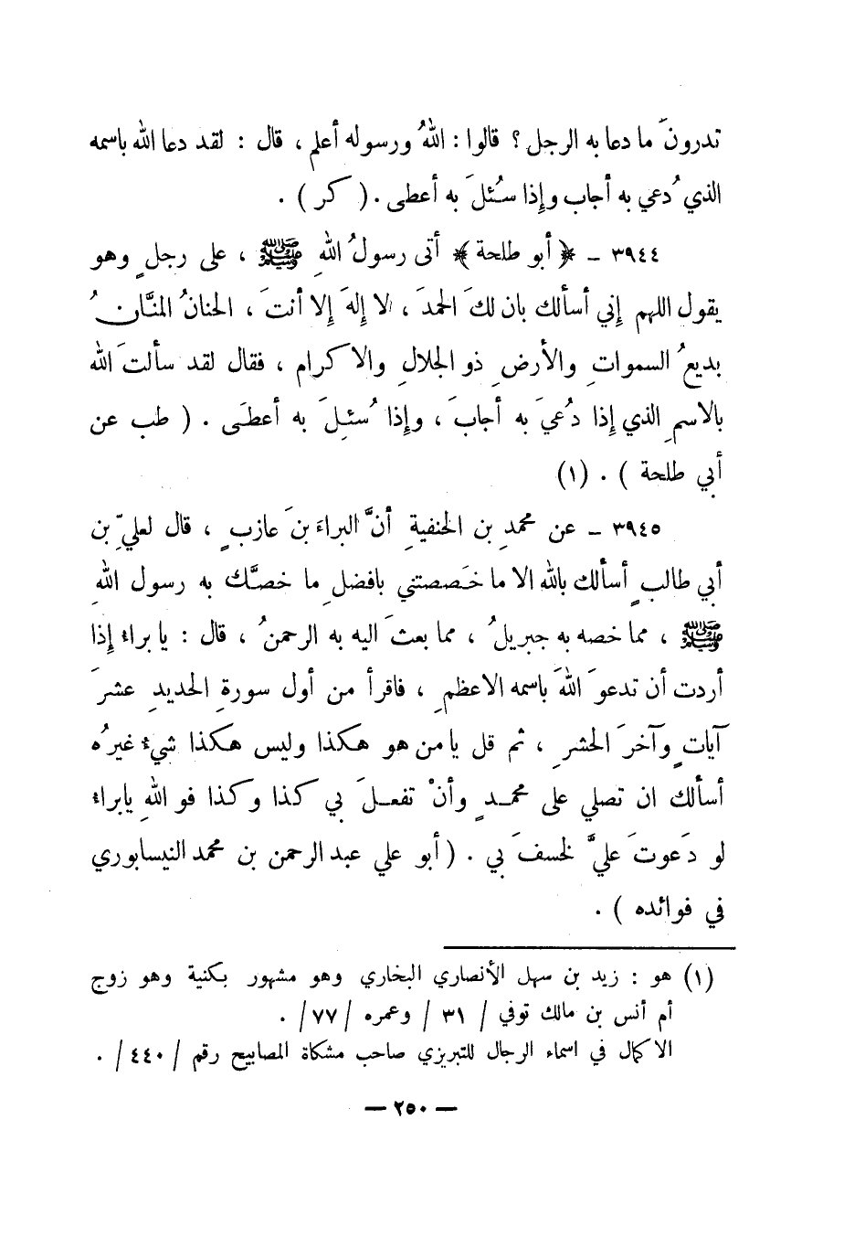 3944 – "أبو طلحة" أتى رسول الله صلى الله عليه وسلم، على رجل وهو يقول "اللهم إني أسألك بأن لك الحمد، لا إله إلا أنت، الحنان المنان بديع السموات والأرض ذو الجلال والاكرام، فقال "لقد سألت الله بالإسم الذي إذا دعي به أجاب، وإذا سئل به أعطى". "طب عن أبي طلحة".1
