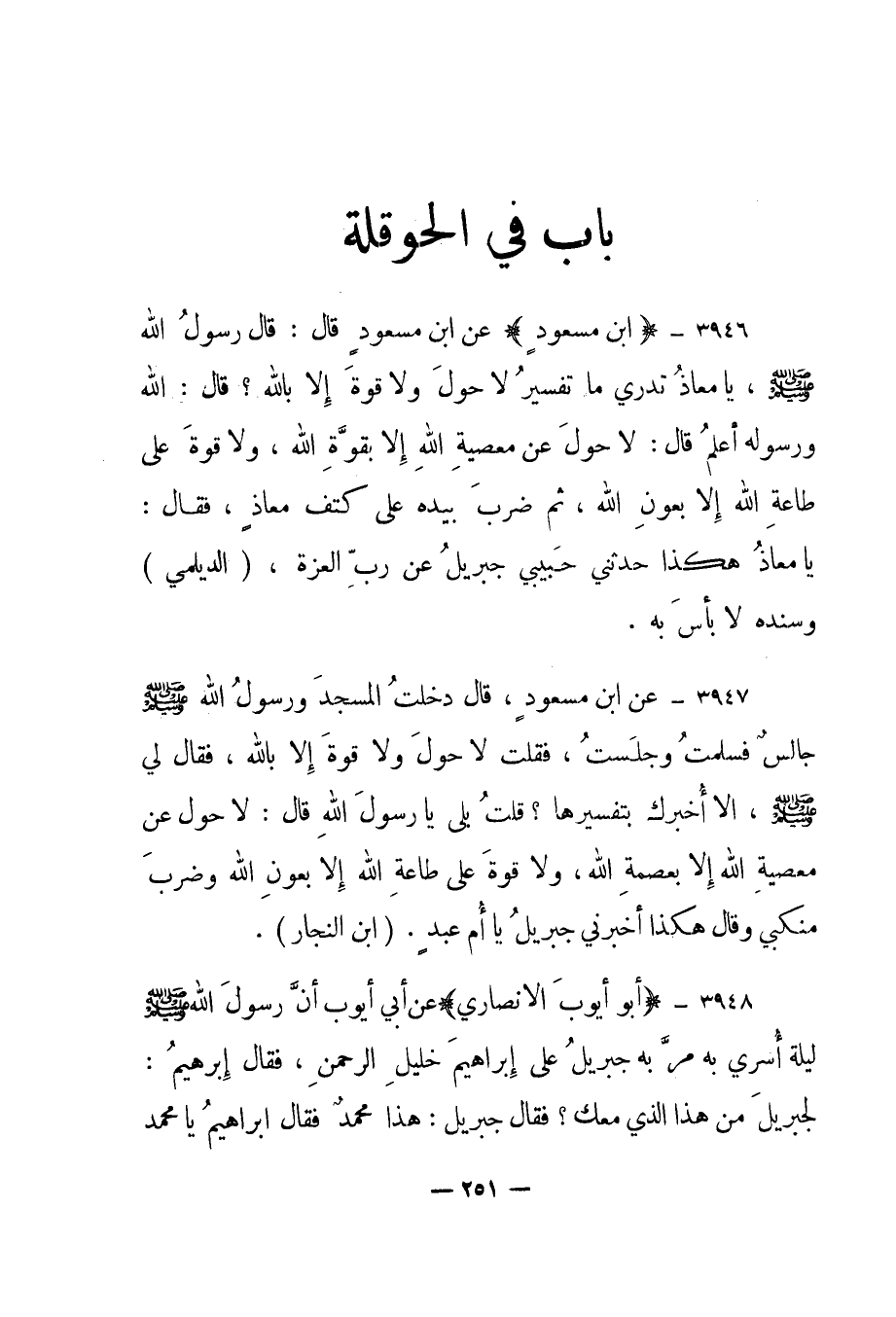 3946 – "ابن مسعود" عن ابن مسعود قال: قال رسول الله صلى الله عليه وسلم، "يا معاذ تدري ما تفسير لا حول ولا قوة إلا بالله؟ قال: الله ورسوله أعلم قال: لا حول عن معصية الله إلا بقوة الله، ولا قوة على طاعة الله إلا بعون الله، ثم ضرب بيده على كتف معاذ، فقال: يا معاذ هكذا حدثني حبيبي جبريل عن رب العزة". "الديلمي" وسنده لا بأس به.