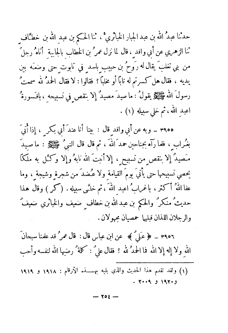 3956 – "علي" عن ابن عباس قال: "قال عمر قد علمنا سبحان الله ولا إله إلا الله فما الحمد لله؟ فقال علي: كلمة رضيها الله لنفسه وأحب