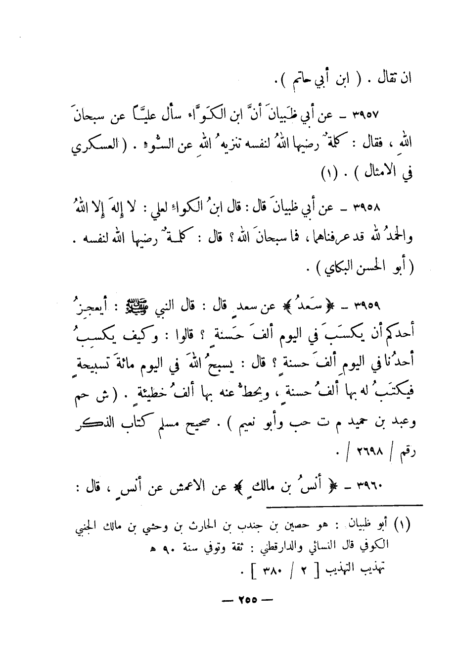 3959 – "سعد" عن سعد قال: قال النبي صلى الله عليه وسلم: "أيعجز أحدكم أن يكسب في اليوم ألف حسنة؟ قالوا: وكيف يكسب أحدنا في اليوم ألف حسنة؟ قال: يسبح الله في اليوم مائة تسبيحة فيكتب له بها ألف حسنة، ويحط عنه بها ألف خطيئة". "ش حم وعبد بن حميد م ت حب وأبو نعيم". صحيح مسلم كتاب الذكر رقم/2698/.