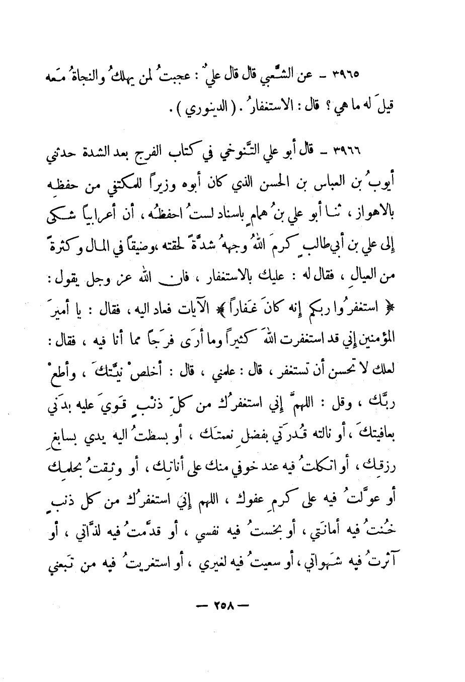 3965 - عن الشعبي قال قال علي: "عجبت لمن يهلك والنجاة معه قيل له ما هي؟ قال: الاستغفار".