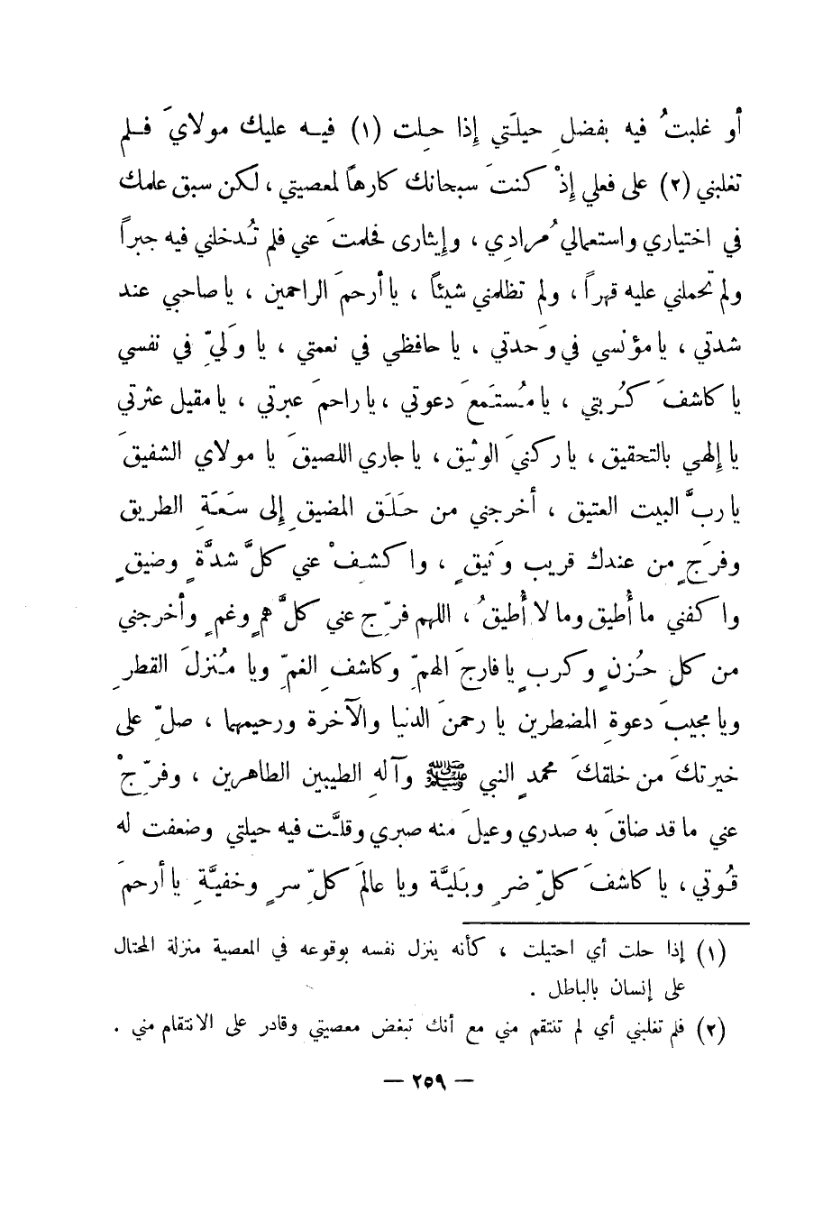 أو غلبت فيه بفضل حيلتي إذا حلت1 فيه عليك مولاي فلم تغلبني2 على فعلي إذ كنت سبحانك كارها لمعصيتي، لكن سبقك علمك في اختياري واستعمالي مرادي، وإيثاري فحلمت عني فلم تدخلني فيه جبرا ولم تحملني عليه قهرا، ولم تظلمني شيئا، يا أرحم الراحمين، يا صاحبي عند شدتي، يا مؤنسي في وحدتي، يا حافظي في نعمتي، يا ولي في نفسي يا كاشف كربتي، يا مستمع دعوتي، يا راحم عبرتي، يا مقيل عثرتي يا إلهي بالتحقيق، يا ركني الوثيق، يا جاري اللصيق يا مولاي الشفيق يا رب البيت العتيق، أخرجني من حلق المضيق إلى سعة الطريق وفرج من عندك قريب وثيق، واكشف عني كل شدة وضيق واكفني ما أطيق وما لا أطيق، اللهم فرج عني كل هم وغم وأخرجني من كل حزن وكرب يا فارج الهم وكاشف الغم ويا منزل القطر ويا مجيب دعوة المضطرين يا رحمن الدنيا والآخرة ورحيمهما، صل على خيرتك من خلقك محمد النبي صلى الله عليه وسلم وآله الطيبين الطاهرين، وفرج عني ما قد ضاق به صدري وعيل منه صبري وقلت فيه حيلتي وضعفت له قوتي، يا كاشف كل ضر وبلية ويا عالم كل سر وخفية يا أرحم