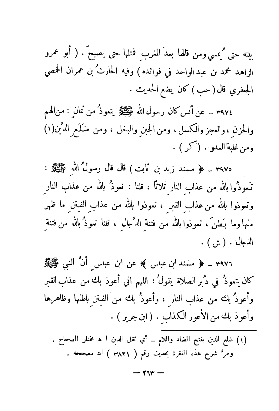 3975 – "مسند زيد بن ثابت" قال "قال رسول الله صلى الله عليه وسلم: "تعوذوا بالله من عذاب النار ثلاثا"، قلنا: نعوذ بالله من عذاب النار "وتعوذوا بالله من عذاب القبر، تعوذوا بالله من عذاب الفتن ما ظهر منها وما بطن، تعوذوا بالله من فتنة الدجال"، قلنا نعوذ بالله من فتنة الدجال". "ش".