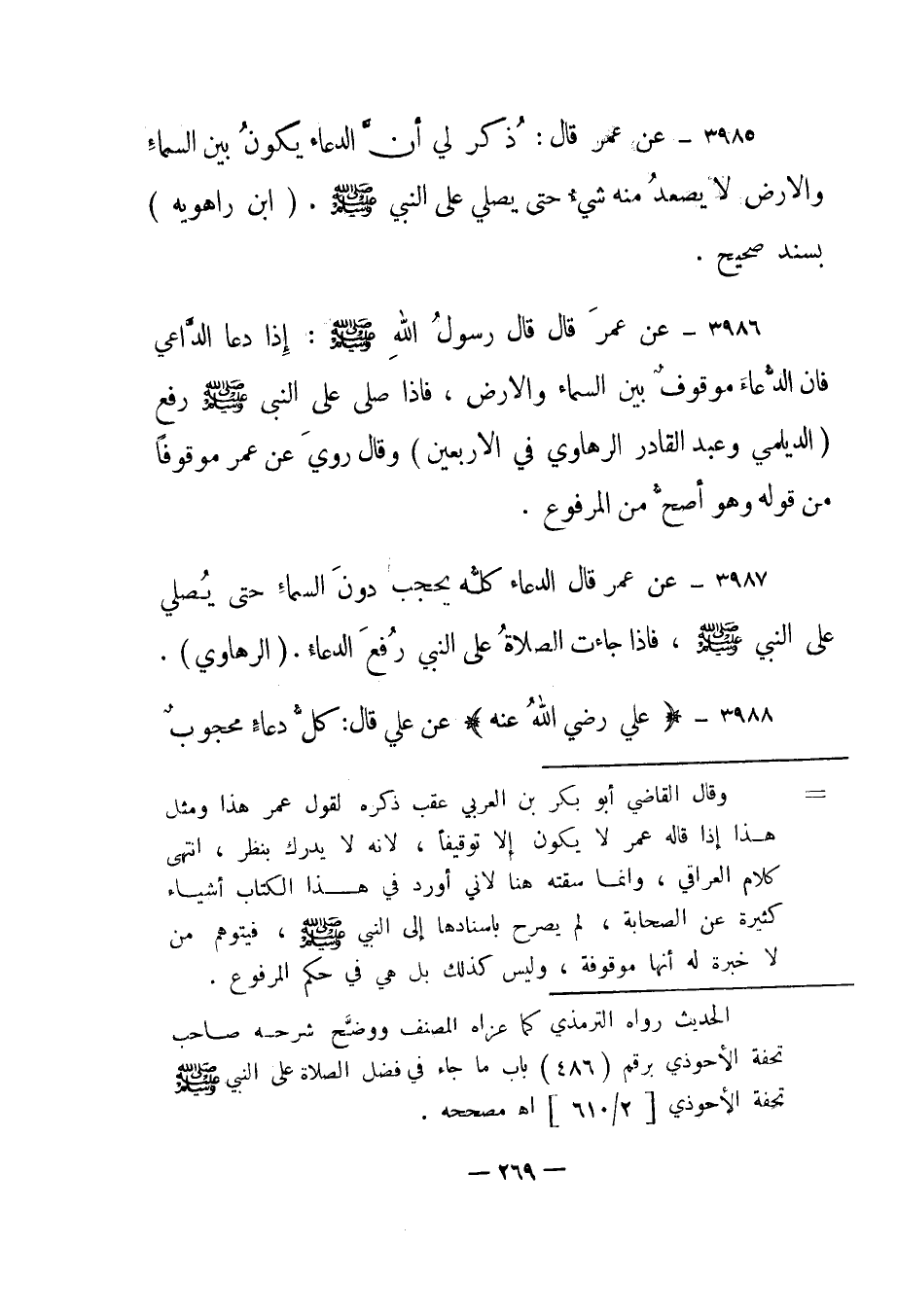 3987 - عن عمر قال "الدعاء كله يحجب دون السماء حتى يصلي على النبي صلى الله عليه وسلم، فإذا جاءت الصلاة على النبي رفع الدعاء". "الرهاوي".
