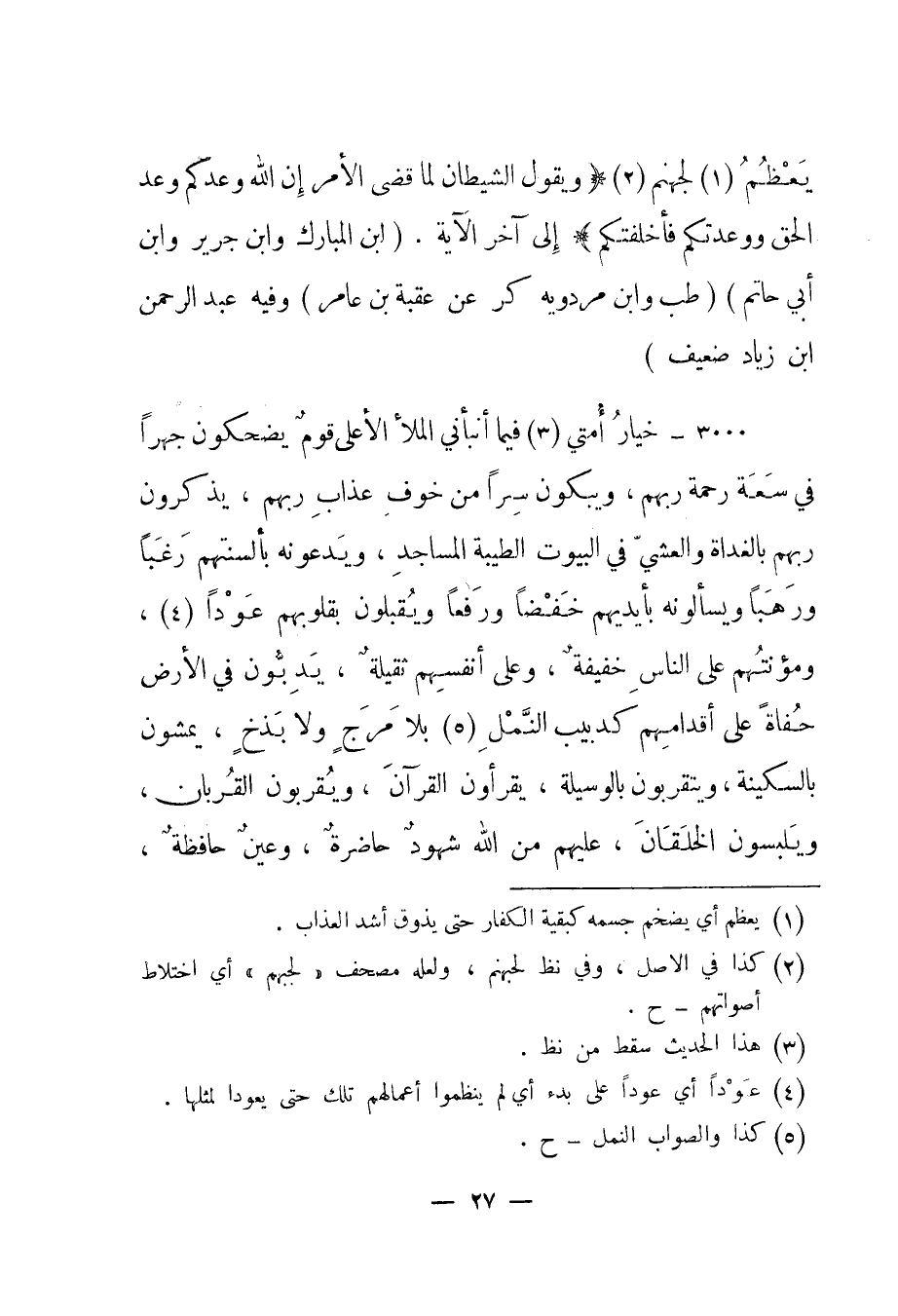 يعظم1 لجهنم2 {وَقَالَ الشَّيْطَانُ لَمَّا قُضِيَ الْأَمْرُ إِنَّ اللَّهَ وَعَدَكُمْ وَعْدَ الْحَقِّ وَوَعَدْتُكُمْ فَأَخْلَفْتُكُمْ} إلى آخر الآية". "ابن المبارك وابن جرير وابن أبي حاتم" "طب وابن مردويه كر عن عقبة بن عامر" وفيه عبد الرحمن بن زياد ضعيف".