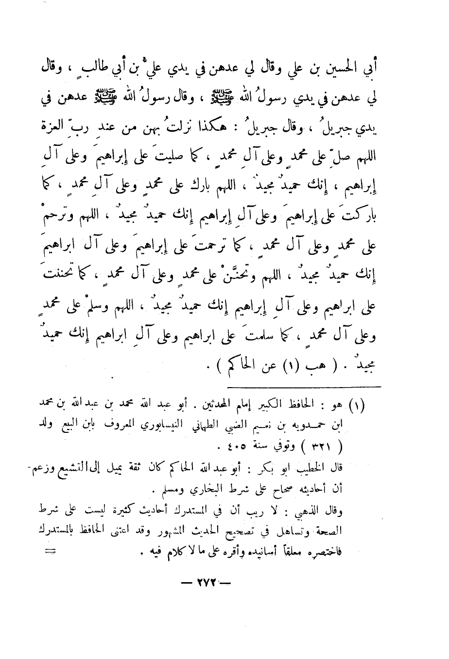 أبي الحسين بن علي وقال لي عدهن في يدي علي بن أبي طالب، وقال لي عدهن في يدي رسول الله صلى الله عليه وسلم، وقال رسول الله صلى الله عليه وسلم "عدهن في يدي جبريل، وقال جبريل: هكذا نزلت بهن من عند رب العزة اللهم صل على محمد وعلى آل محمد، كما صليت على إبراهيم وعلى آل إبراهيم، إنك حميد مجيد، اللهم بارك على محمد وعلى آل محمد، كما باركت على إبراهيم وعلى آل إبراهيم إنك حميد مجيد، اللهم وترحم على محمد وعلى آل محمد، كما ترحمت على إبراهيم وعلى آل إبراهيم إنك حميد مجيد، اللهم وتحنن على محمد وعلى آل محمد، كما تحننت على إبراهيم وعلى آل إبراهيم إنك حميد مجيد، اللهم وسلم على محمد وعلى آل محمد، كما سلمت على إبراهيم وعلى آل إبراهيم إنك حميد مجيد". "هب1 عن الحاكم"