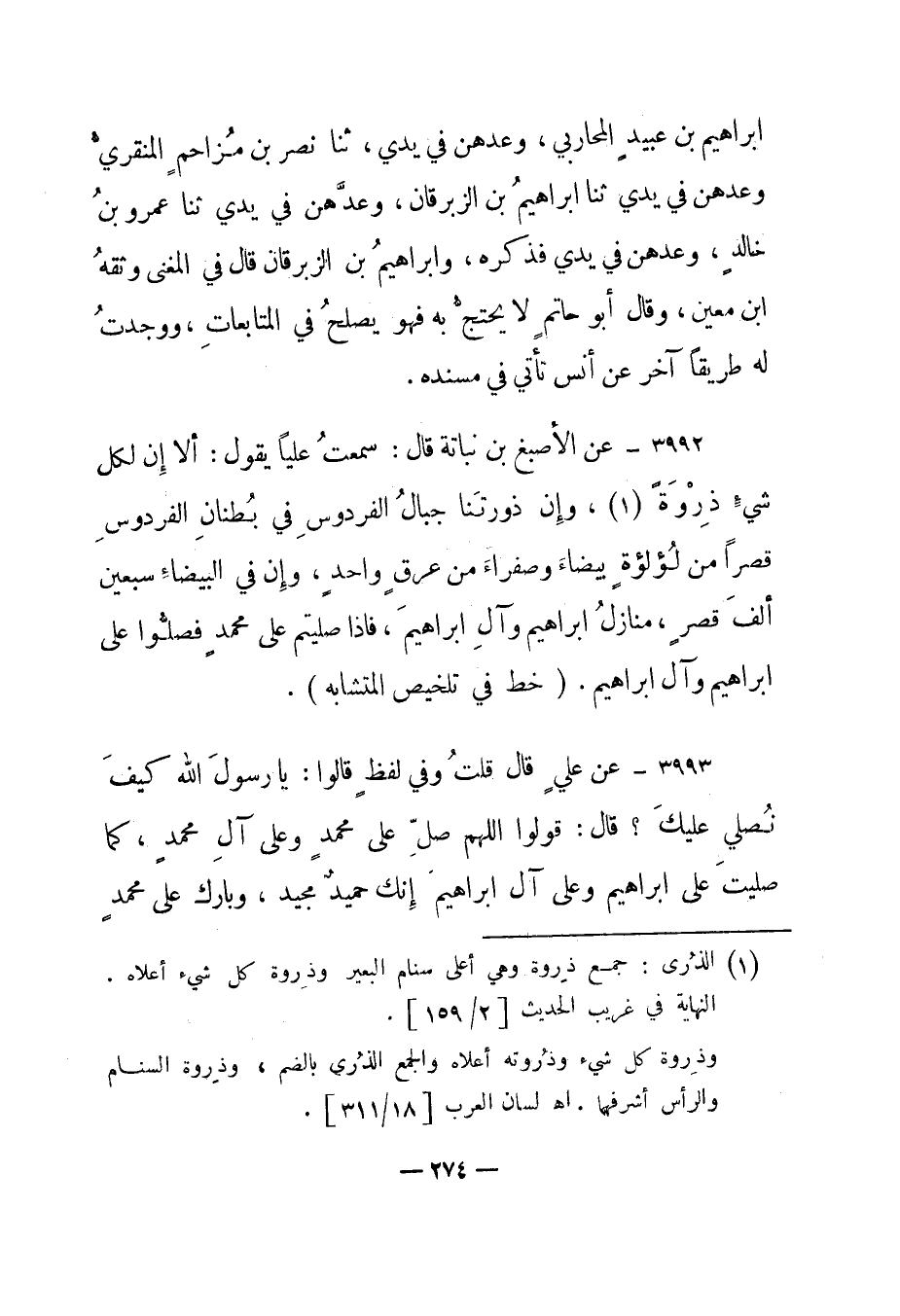 3992 - عن الأصبغ بن نباتة قال: سمعت عليا يقول: "ألا إن لكل شيء ذروة1، وإن ذروتنا جبال الفردوس في بطنان الفردوس قصرا من لؤلؤة بيضاء وصفراء من عرق واحد، وإن في البيضاء سبعين ألف قصر، منازل إبراهيم وآل إبراهيم، فإذا صليتم على محمد فصلوا على إبراهيم وآل إبراهيم". "خط في تلخيص المتشابه".