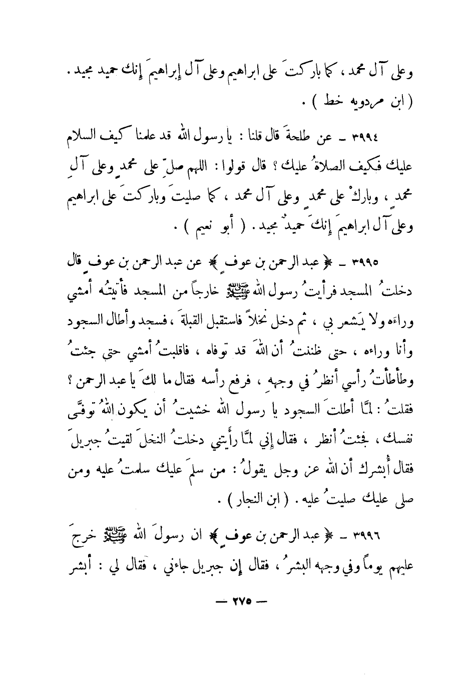 3995 – "عبد الرحمن بن عوف" عن عبد الرحمن بن عوف قال "دخلت المسجد فرأيت رسول الله صلى الله عليه وسلم خارجا من المسجد فأتيته أمشي وراءه ولا يشعر بي، ثم دخل نخلا فاستقبل القبلة، فسجد وأطال السجود وأنا وراءه، حتى ظننت أن الله قد توفاه، فأقبلت أمشي حتى جئت وطأطأت رأسي أنظر في وجهه، فرفع رأسه فقال ما لك يا عبد الرحمن؟ فقلت: لما أطلت السجود يا رسول الله خشيت أن يكون الله توفى نفسك، فجئت أنظر، فقال إني لما رأيتني دخلت النخل لقيت جبريل فقال أبشرك أن الله عز وجل يقول: من سلم عليك سلمت عليه ومن صلى عليك صليت عليه ". "ابن النجار".