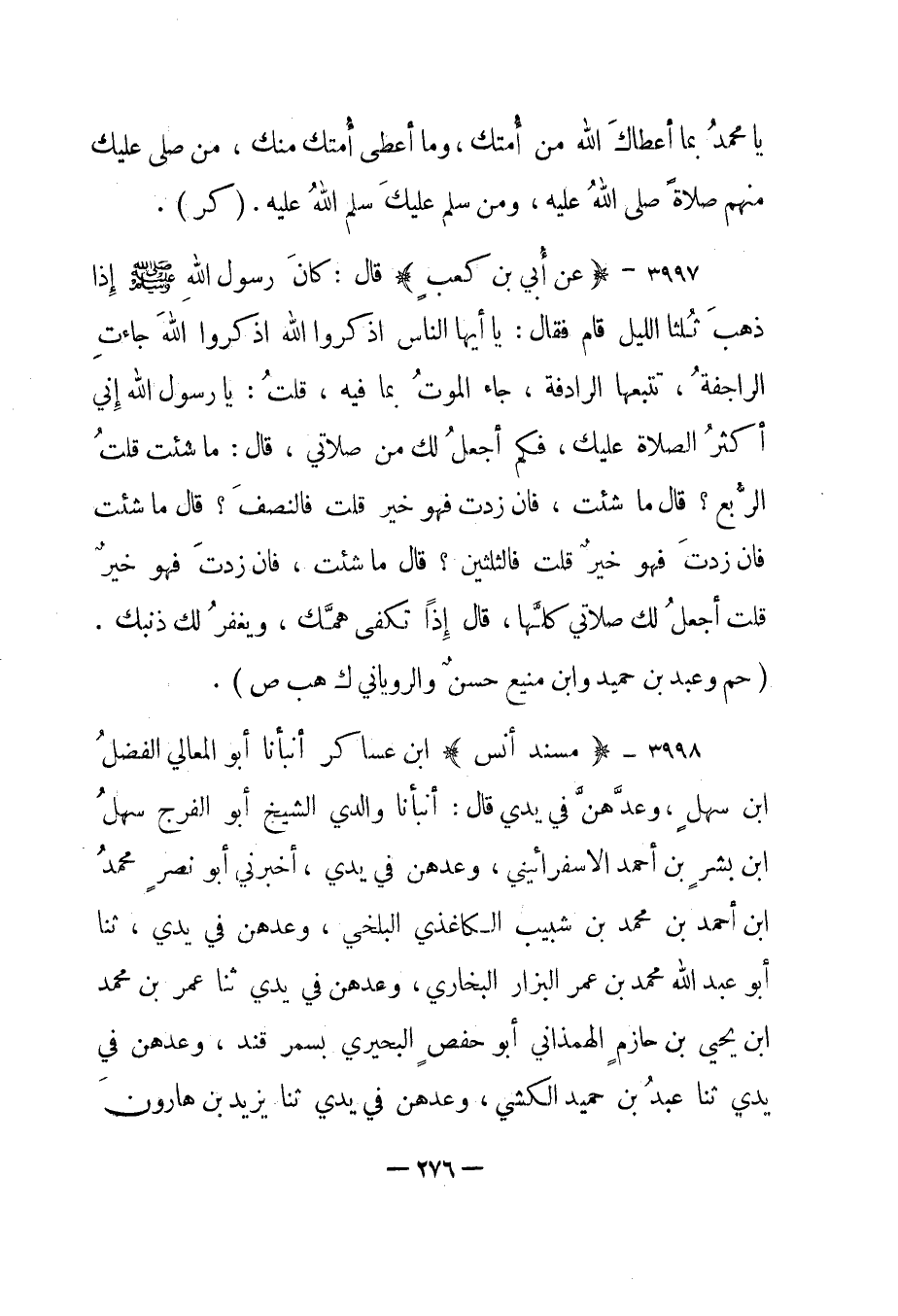 3997 – "عن أبي بن كعب" قال: "كان رسول الله صلى الله عليه وسلم إذا ذهب ثلثا الليل قام فقال: يا أيها الناس اذكروا الله اذكروا الله جاءت الراجفة، تتبعها الرادفة، جاء الموت بما فيه، قلت: يا رسول الله إني أكثر الصلاة عليك، فكم أجعل لك من صلاتي، قال: ما شئت قلت الربع؟ قال ما شئت، فإن زدت فهو خير قلت فالنصف؟ قال ما شئت فإن زدت فهو خير قلت فالثلثين؟ قال ما شئت، فإن زدت فهو خير قلت أجعل لك صلاتي كلها، قال إذا تكفى همك، ويغفر لك ذنبك ". "حم وعبد بن حميد وابن منيع حسن والروياني ك هب ص".