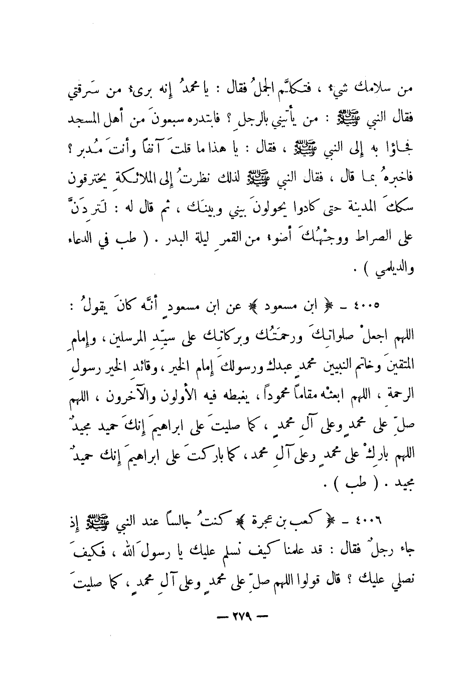 4005 – "ابن مسعود" عن ابن مسعود أنه كان يقول: "اللهم اجعل صلواتك ورحمتك وبركاتك على سيد المرسلين، وإمام المتقين وخاتم النبيين محمد عبدك ورسولك إمام الخير، وقائد الخير رسول الرحمة، اللهم ابعثه مقاما محمودا، يغبطه فيه الأولون والآخرون، اللهم صل على محمد وعلى آل محمد، كما صليت على إبراهيم إنك حميد مجيد اللهم بارك على محمد وعلى آل محمد، كما باركت على إبراهيم إنك حميد مجيد". "طب".