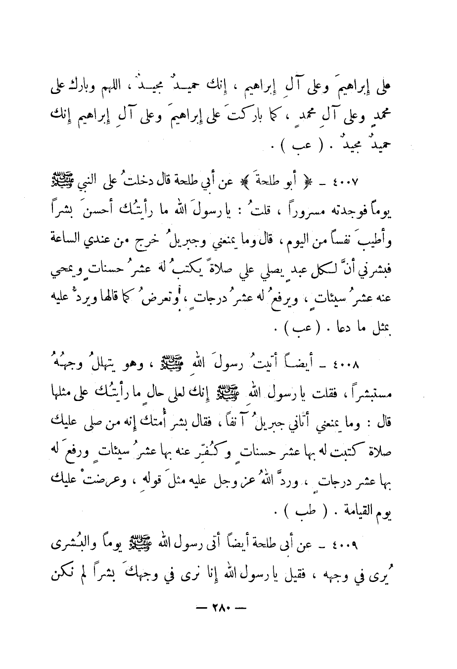 4007 – "أبو طلحة" عن أبي طلحة قال "دخلت على النبي صلى الله عليه وسلم يوما فوجدته مسرورا، قلت: يا رسول الله ما رأيتك أحسن بشرا وأطيب نفسا من اليوم، قال وما يمنعني وجبريل خرج من عندي الساعة فبشرني أن لكل عبد يصلي علي صلاة يكتب له عشر حسنات ويمحي عنه عشر سيئات، ويرفع له عشر درجات، وتعرض كما قالها ويرد عليه بمثل ما دعا ". "عب".