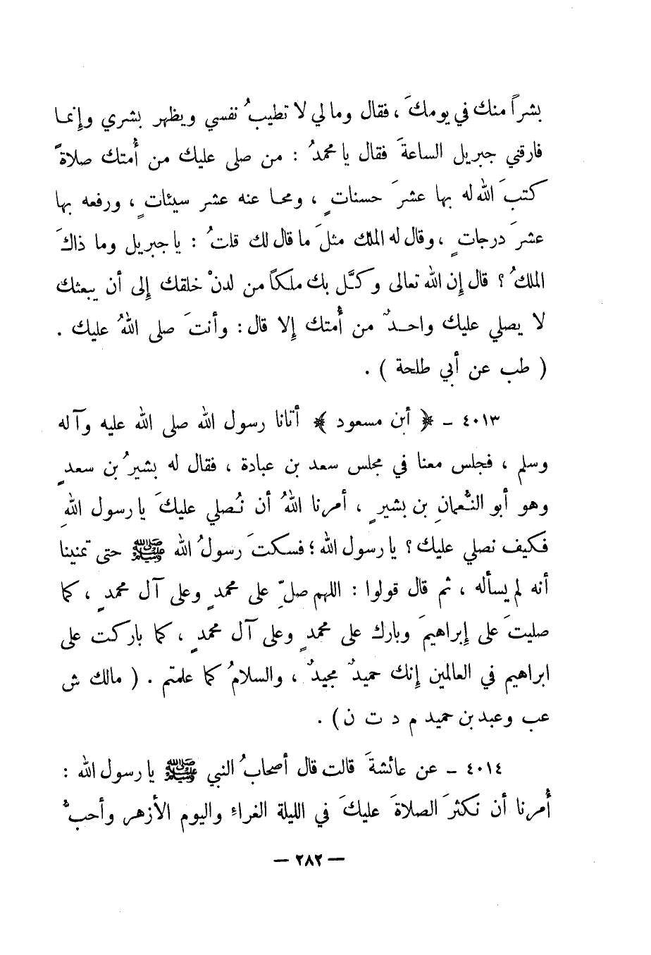 4013 – "ابن مسعود" "أتانا رسول الله صلى الله عليه وآله وسلم، فجلس معنا في مجلس سعد بن عبادة، فقال له بشير بن سعد وهو أبو النعمان بن بشير، أمرنا الله أن نصلي عليك يا رسول الله فكيف نصلي عليك؟ يا رسول الله؛ فسكت رسول الله صلى الله عليه وسلم حتى تمنينا أنه لم يسأله، ثم قال قولوا: اللهم صل على محمد وعلى آل محمد، كما صليت على إبراهيم وبارك على محمد وعلى آل محمد، كما باركت على إبراهيم في العالمين إنك حميد مجيد، والسلام كما علمتم ". "مالك ش عب وعبد بن حميد م د ت ن".