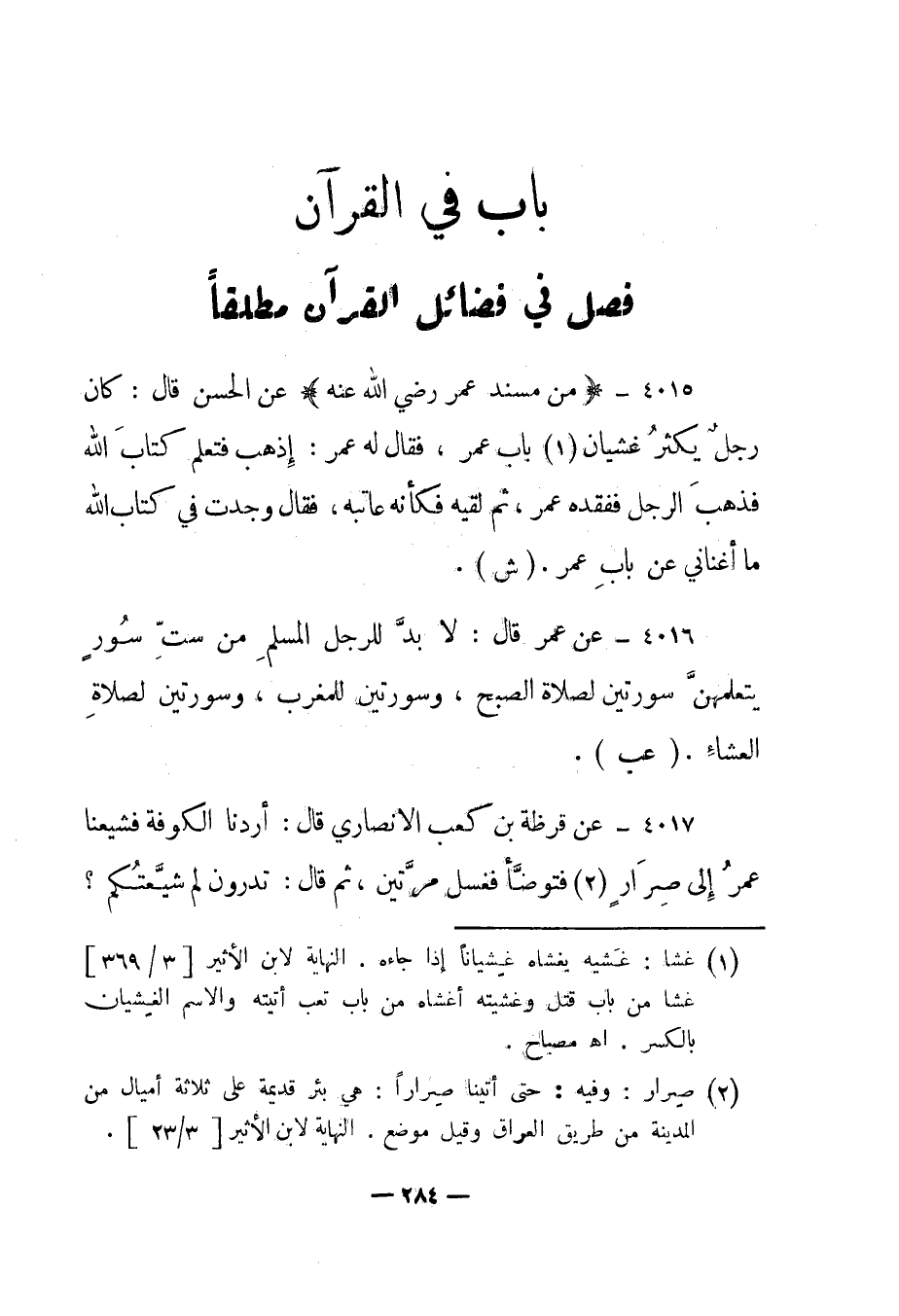 4017 - عن قرظة بن كعب الأنصاري قال: "أردنا الكوفة فشيعنا عمر إلى صرار2 فتوضأ فغسل مرتين، ثم قال: تدرون لم شيعتكم؟