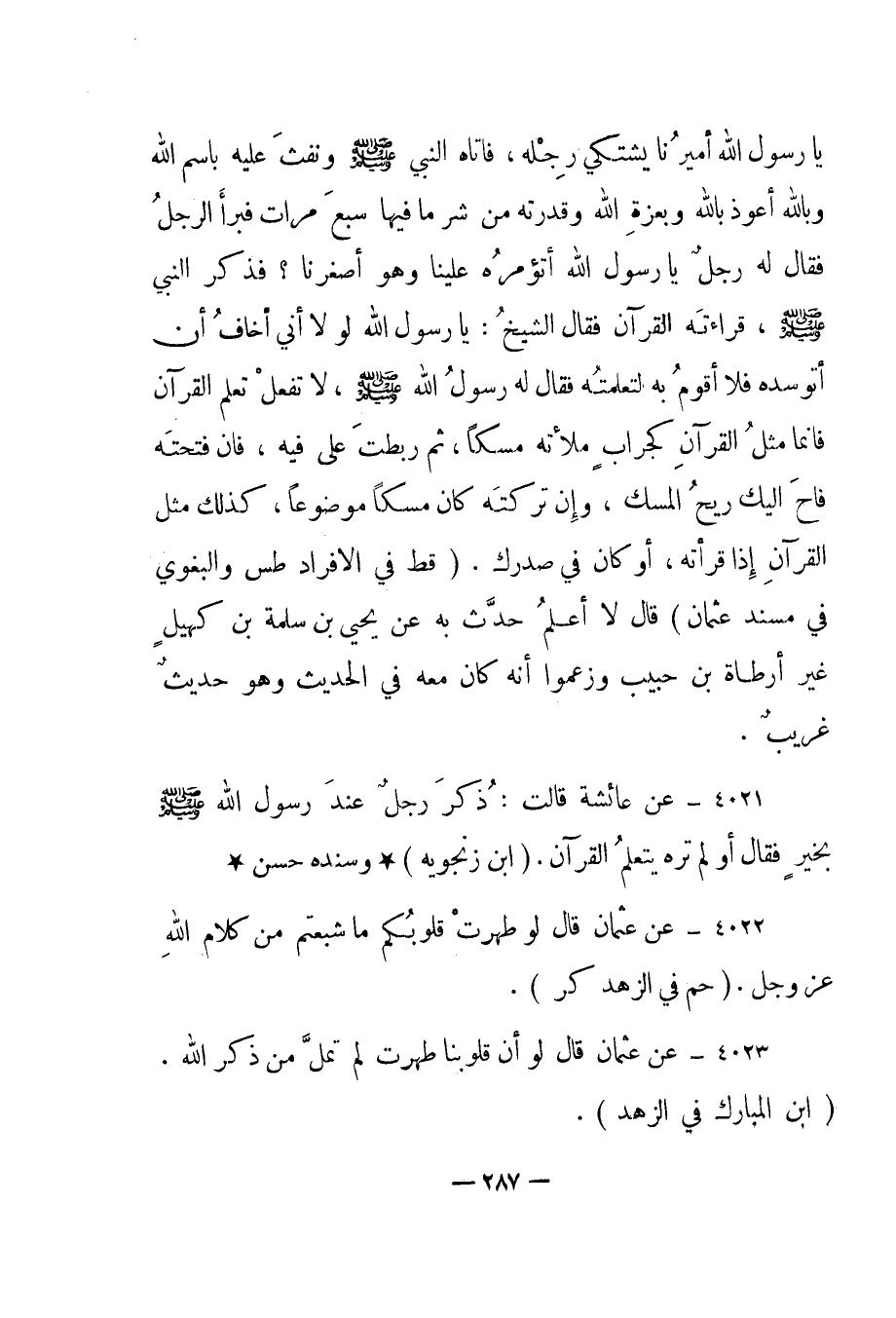 4022 - عن عثمان قال "لو طهرت قلوبكم ما شبعتم من كلام الله عز وجل" "حم في الزهد كر".