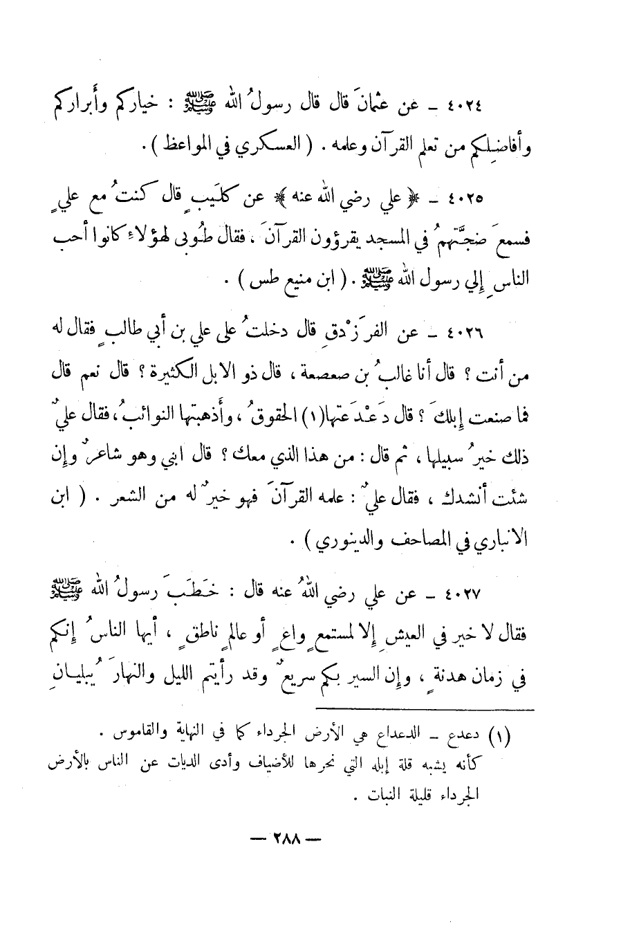 4026 - عن الفرزدق قال "دخلت على علي بن أبي طالب فقال له من أنت؟ قال أنا غالب بن صعصعة، قال ذو الإبل الكثيرة؟ قال نعم قال فما صنعت إبلك؟ قال دعدعتها1 الحقوق، وأذهبتها النوائب، فقال علي ذلك خير سبيلها، ثم قال: من هذا الذي معك؟ قال ابني وهو شاعر وإن شئت أنشدك، فقال علي: علمه القرآن فهو خير له من الشعر". "ابن الأنباري في المصاحف والدينوري".