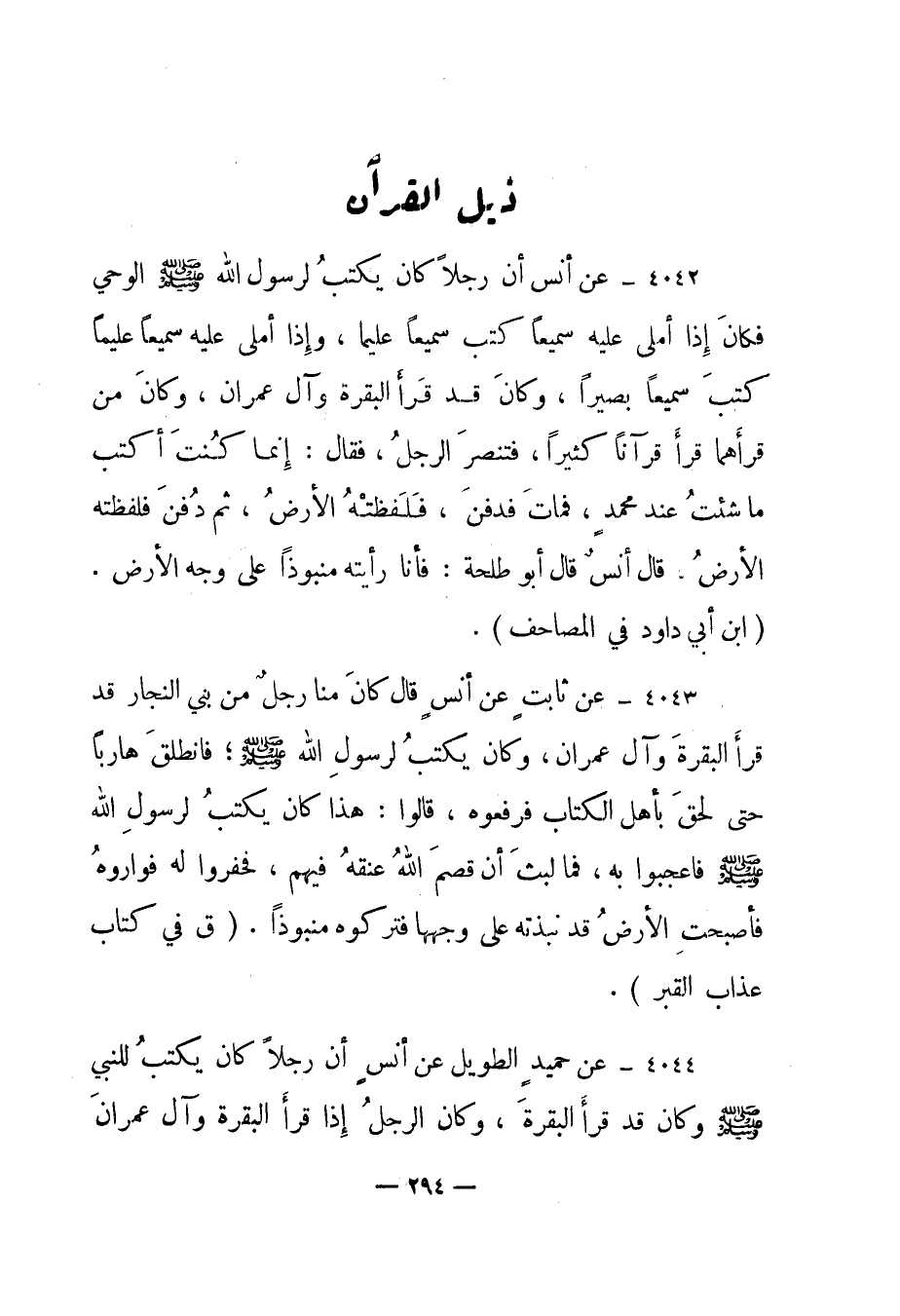 4043 - عن ثابت عن أنس قال "كان منا رجل من بني النجار قد قرأ البقرة وآل عمران، وكان يكتب لرسول الله صلى الله عليه وسلم؛ فانطلق هاربا حتى لحق بأهل الكتاب فرفعوه، قالوا: هذا كان يكتب لرسول الله صلى الله عليه وسلم فأعجبوا به، فما لبث أن قصم الله عنقه فيهم، فحفروا له فواروه فأصبحت الأرض قد نبذته على وجهها فتركوه منبوذا". "ق في كتاب عذاب القبر".