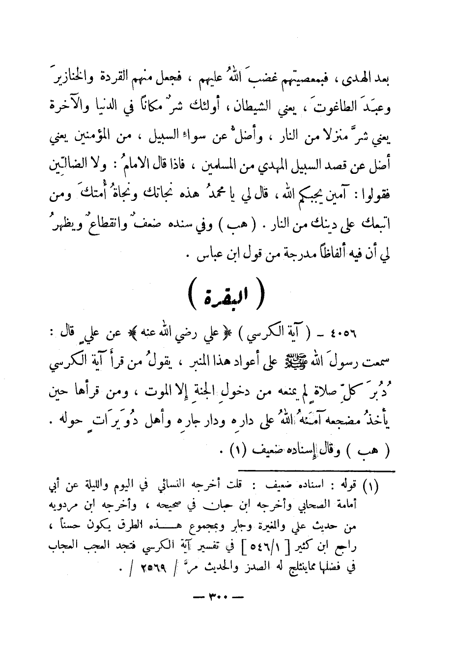1 قوله: إسناده ضعيف: قلت أخرجه النسائي في اليوم والليلة عن أبي أمامة الصحابي وأخرجه ابن حبان في صحيحه، وأخرجه ابن مردويه من حديث علي والمغيرة وجابر وبمجموع هذه الطرق يكون حسنا، راجع ابن كثير [1/546] في تفسير آية الكرسي فتجد العجب العجاب في فضلها مما ينثلج له الصدر والحديث مر/2569/.